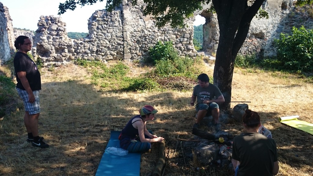 Reggel még tábortűznél sütöttünk reggelit, utána pedig megnéztük az egész vár legindokolatlanabb helyszínét, a félig beomlott kápolnát, ahova úgy kúsztunk be egy lyukon át. Már maga a hűvös terem is impozáns volt, de a kisebb terem, ahova átjutottunk, egészen borzalmasan krípi volt. Nem mi voltunk az elsők, akik ott jártak: a terem hátsó falánál egy hatalmas állati koponya volt elhelyezve, rajta valami piros (inkább festék, mint vér), előtte kis kövecskék körben, mint egy okkult szertartás része. Két opció van: vagy live szerepjátékosok jártak arra, vagy szektások. Ha előző este lemerészkedünk a kápolnába, lehet, hogy nem aludtunk volna olyan nyugodtan. (Nekem erről sajnos nincs fotóm.)