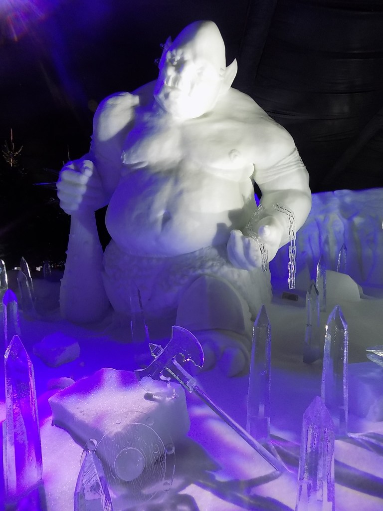 Miután leadtuk a jegyeket és betessékeltek az előtérbe, mások példáját követve elkezdtünk rendesen felöltözni: sapka, sál, kesztyű. A -8 az -8 fok, ezen a hőmérsékleten tárolják a jégszobrokat. Ahogy beléptünk, meg is csapott a jeges levegő. Az első pillantásra látszott, hogy egy alapvetően hangulatos, de iszonyatosan felülárazott látványosságra érkeztünk. A jégszobrok szépen kidolgozottak voltak, de én arra számítottam, hogy sokkal több lesz belőlük. Fél óra alatt végig lehetett járni a kiállítást, bár az is igaz, hogy ennél több időt abban a hidegben egyébként se nagyon lehet eltölteni. A szobrok témáját se nagyon értettem, nem vágom, miért jó az, ha félelmetesnél félelmetesebb goblinokat mutogatnak a háromszázadik ugyanolyan mókussal. Mindezek ellenére én baromira tudtam élvezni, elvarázsolt minden egyes szobor, de valahol mélyen tudtam, hogy ez a látványosság alapvetően gyerekeknek szól, mi vagyunk csak ilyenek, hogy ezt a tényt leszarjuk. Én beálltam a sorba a gyerekek közé és lecsúsztam a nagycsúzdán, és ilyen jót még sose csúsztam. 😀