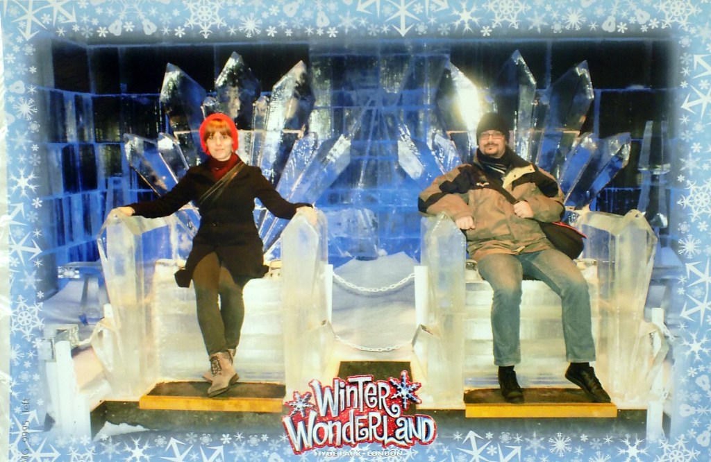 Ha akartad és megvártad, amíg az előtted levők végigszerencsétlenkedik, rólad is készített a kihelyezett fotós képeket. Ez úgy ment, hogy a kijáratnál a pultos lányok a képedbe tolták a már kinyomtatott fotókat, hogy tessék, meg lehet venni. Ha már egyszer ki van nyomtatva, a francnak van kedve otthagyni. És ha már a kettő 10 font, az egy meg 8, akkor nyilván megveszed mindkettőt, mondván, hogy azon a két fonton már nem múlik. A fotós meg szerintem gyűlöli a munkáját és az a hobbija, hogy minél borzalmasabb pillanatukban kapja el az alanyait, mert esküszöm, nem nehéz rólam értelmes képet csinálni, na neki nem sikerült. Mindegy, van két iszonyat giccses előnytelen kép rólunk az ice kingdomból. 😀