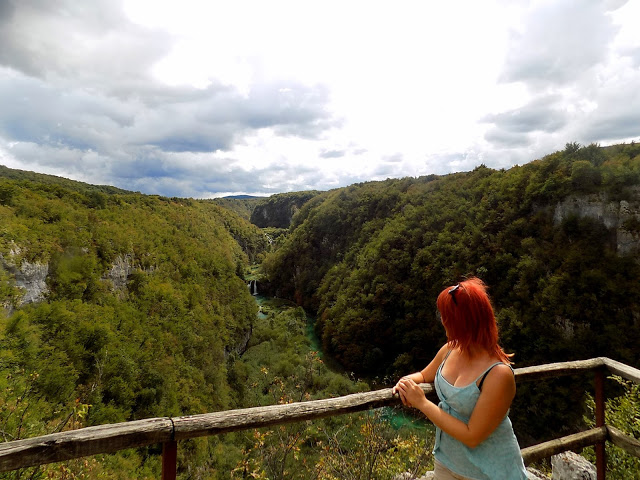 Plitvicei tavak felé utaztunk. Annyi időnk már nem volt, hogy be is menjünk, de megálltunk egy magaslaton, ahonnan pont ráláttunk a vízesésekre.