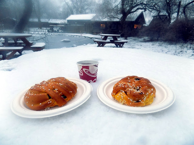 A medvék aludtak. Mire idáig jutottunk a sétában, kezdett sötétedni, lefagyott a lábunk, – főleg foxé, aki sportcipőben jött Stockholmba, mert nem gondolta, hogy havazni fog. 😀 Úgy döntöttünk, ideje megkeresni a karácsonyi vásárt. Fájt a szívem, mert az összes épület olyan volt, hogy megnéztem volna közelebbről, de egyszerűen nem fért bele az időbe. A vásár a skanzen közepén helyezkedik el, a fő portéka a kaja minden formában: sütik, húsok, bonbonok, csoki minden mennyiségben. Forralt bort viszont alig találtunk, és azt is csak extramini kiszerelésben, jó, ha volt egy deci. Találgattuk, mi lehet az oka, én arra tippelek, hogy köze lehet a meglehetősen szigorúan szabályzott alkoholárusításhoz. Boltban 3,5%-nál magasabb alkoholtartalmú italokat csak a systembolagetekben lehet kapni, és ezek a boltok legkésőbb este 7-kor bezárnak. A vásárban ráadásul ki is írták, hogy 2,2%-os a forralt bor, szóval komolyan veszik.