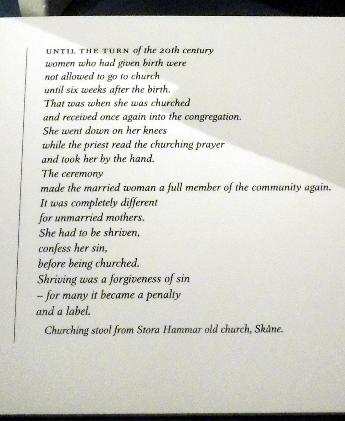 A sötétség és fény hatását mutatta be a svéd lélekre és a mindennapokra egészen a középkortól napjainkig. Én amúgy teljesen megvilágosodtam (megvilágosodtam, haha, érted): jobban értem az északi lelket. Ahogy teremről teremre haladtam, egyre több lett a fény; az első szobában csak kandallótűz égett, gyertyák, olajlámpák, gázlámpák, majd a végére eljutottunk napjaink fényárjáig. Azt hiszem, most már értem, miért van az, hogy Svédországban sötét van. Nem úgy értem, hogy ha lemegy a nap akkor besötétedik, hanem az utcai lámpák is csak gyenge fényt adnak, az épületeket nem világítják ki erősen, az a szintű fényesség, ami Budapesten van esténként, teljesen elképzelhetetlen Stockholmban. Mész az utcán, és egyszerűen azt érzed, hogy túl kevés a fény, időnként alig látsz. Biztos van ebben egy adag igyekvés a fényszennyezés csökkentésére, mert úgy tűnik, elég komolyan veszik, de felmérések alapján a svédek otthon is jobban szeretik a gyenge fényt, a félhomálytól érzik magukat kényelmesen. Meg tudom érteni, jobban természetes fény érzetet kelt, ha nincs kivilágítva az egész szoba, hanem egy-két kisebb lámpa ég.