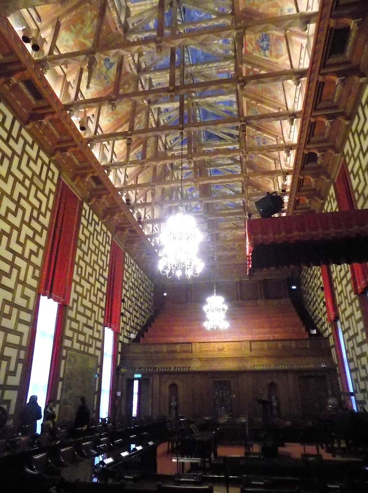 A túravezetőnk elmesélte, hogy az ülések nyilvános. Külön lelátót kapnak az újságírók, hogy elsőkézből értesüljenek a hírekről, és bárki bemehet egy ilyen ülésre, még csak svéd állampolgárnak se kell lennie. Emellett online is közvetítik. És egyébként a városnak nincsen polgármestere.
