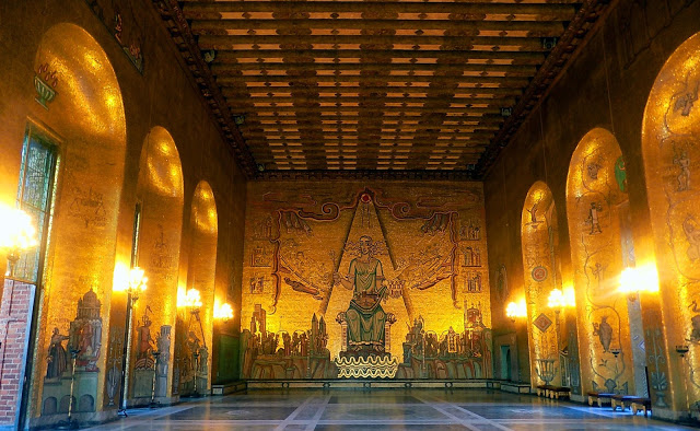 1907-ben döntött úgy a stockholmi városvezetés, hogy új városháza épületre van szükség. Pályázatot írtak ki, amit Ragnar Östberg nyert meg. 20 évig folyt az építkezés, a hivatalos megnyitó 1923 júniusában volt. Ma a kék teremben tartják a Nobel díjátadó utáni bankettet, maga a díjátadás máshol történik.