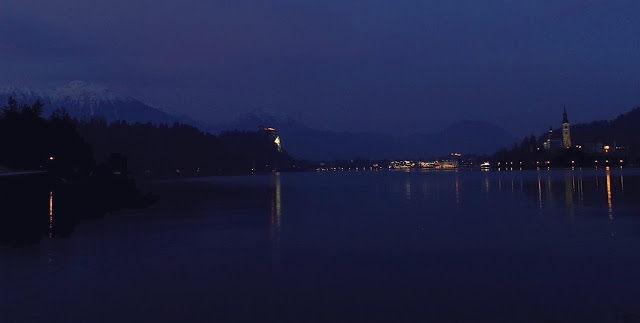 Épp sötétedni kezdett, mikor Bledbe értünk. Leparkoltunk a szállás előtt, és becsekkolás előtt tettünk egy kört a tó körül. Eredetileg csak egy kicsit akartunk sétálni, de úgy belelendültünk, hogy egy karika lett belőle.