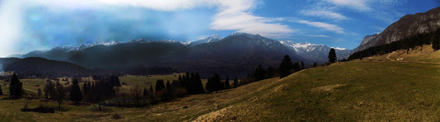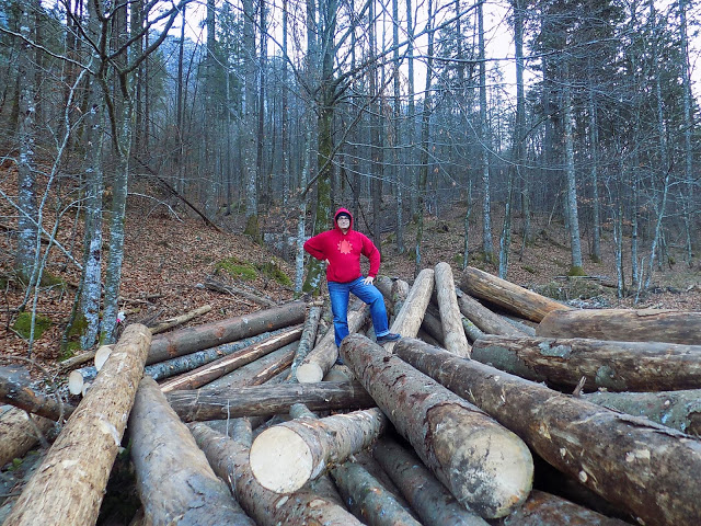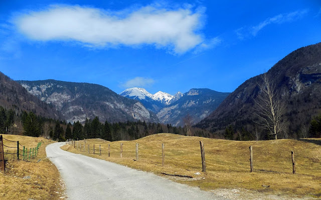 Ezt a túrát néztük ki: 11 km, a képek alapján gyönyörű, a leírás alapján közepesen nehéz. Na igen. Azzal nem számoltunk, hogy az alpesi falvak 550 m-en vannak, a túra kiindulópontja viszont 1054-nél kezdődik. Az utolsó falut magunk mögött hagyva elindultunk a Triglav Nemzeti Park szűk erdei útján. Meredek volt az út, néha dobbant is a szívem, ahogy lepillantottam az út melletti szakadékba. Na még akkor hogy dobogott, amikor az út elkezdett havas-jeges lenni, és a kerék csak kapart, és elakadtunk a jégen. Enyhe halálfélelemben éltem át, ahogy többszöri felfelé irányuló próbálkozás után Kincső visszatolatott a kanyarba, és egy szélesebb szakaszon megfordult. (A hátsó ülésről totál nem látszott, milyen sok hely van a megfordulásra. Én csak azt láttam, hogy mindjárt lezuhanunk.) Bármennyire szerettük volna, nem tudtunk feljutni a túra indulópontjához, úgyhogy újraterveztük a programot. Egy rövid sétát azért tettünk a magaslati erdőben, ha már odáig felmentünk.