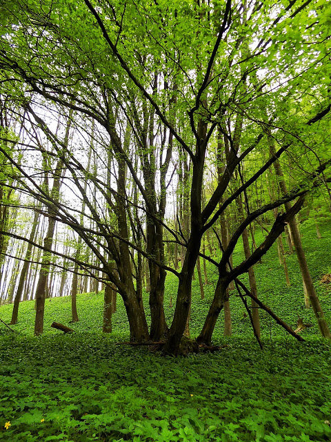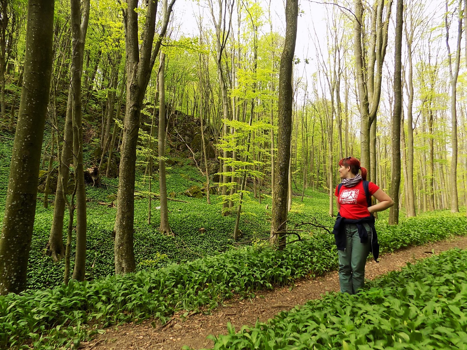 Nagyon szeretem ezt a szakaszt. Az elején mászni kell, de elképesztő gyönyörű, ahogy mindent beterít a medvehagyma. Sokkal durvábban, mint a Mecsekben. Mázli, hogy az emberek nem jöttek még rá, hogy itt is lehetne szedni. Valahogy a Bakonyban nem akkora divat, mint Pécsett. Egy olyan túrázót se láttam rajtunk kívül, aki gyűjtötte volna, amin azért meglepődtem. Nem szedtünk olyan sokat mi sem, nekem még tavalyról is maradt lefagyasztva, most nem akartam megint beleesni abba a hibába, hogy többet szedek, mint amennyi elfogy.
