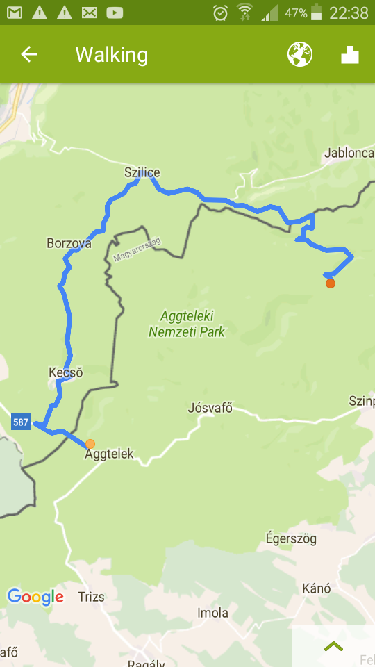 Borzova után volt egy kis kalandunk a térképpel. Az útjelző tábla egyértelműen mutatta, merre kell haladnunk. 5-10 perc múlva néztem rá az appra, és azt láttam, hogy letértünk a jelzett útról. Elbizonytalanodtunk, hogy mi történt, mert tényleg egyértelmű volt a tábla, és nem is láttunk más lehetőséget, amerre mehettünk volna. Azt kisilabizáltuk, hogy a jelzetlen út visszavisz az általunk követett piros jelzésre, úgyhogy nem aggódtunk túlságosan. Vissza is vitt, és ott újra megerősítést nyertünk, mert újabb táblát láttunk, ami az érkezésünk irányába mutatta a pirosat. Valószínűleg átrakták ezt a rövid szakaszt, és se a fizikai térkép, se az applikáció nem frissült.