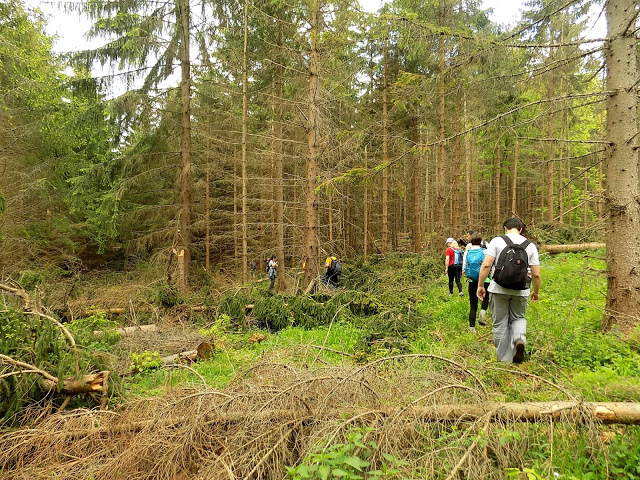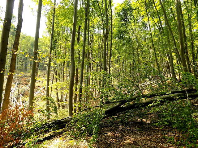 Visszaértünk a földútra és vele együtt az erdőbe. Megmásztunk egy dombot, utána elkezdtünk leereszkedni Lillafüred felé. Igen ám, de egy helyen olyan sűrűn állták utunkat a kidőlt fák, hogy lehetetlenség volt továbbhaladni. A domboldalon csúszkáltunk le, kikerülve a járhatatlan szakaszt.