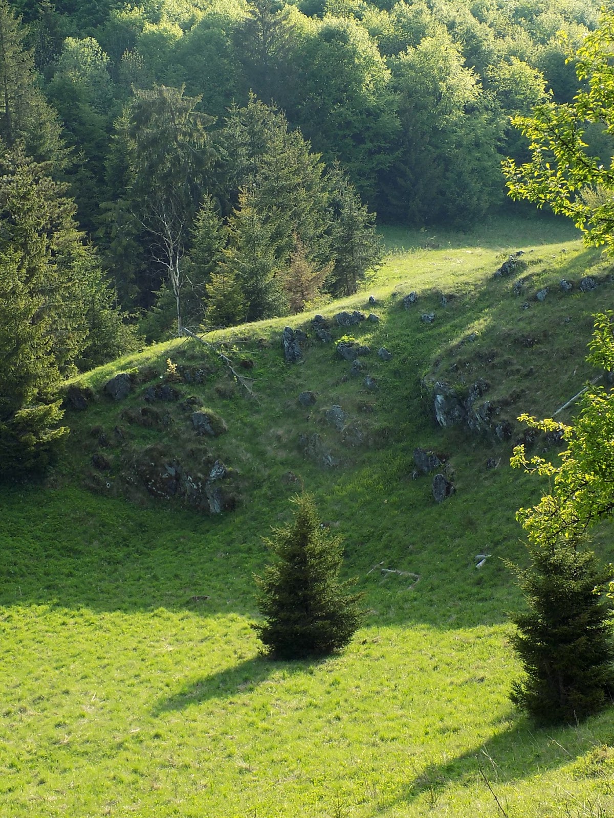 A völgy felfelé kanyargott, emelkedő követett emelkedőt. Végül felértünk a tetőre, ahol egy kellemes mezőt találunk, a közepén egy gondozott katonasírral.