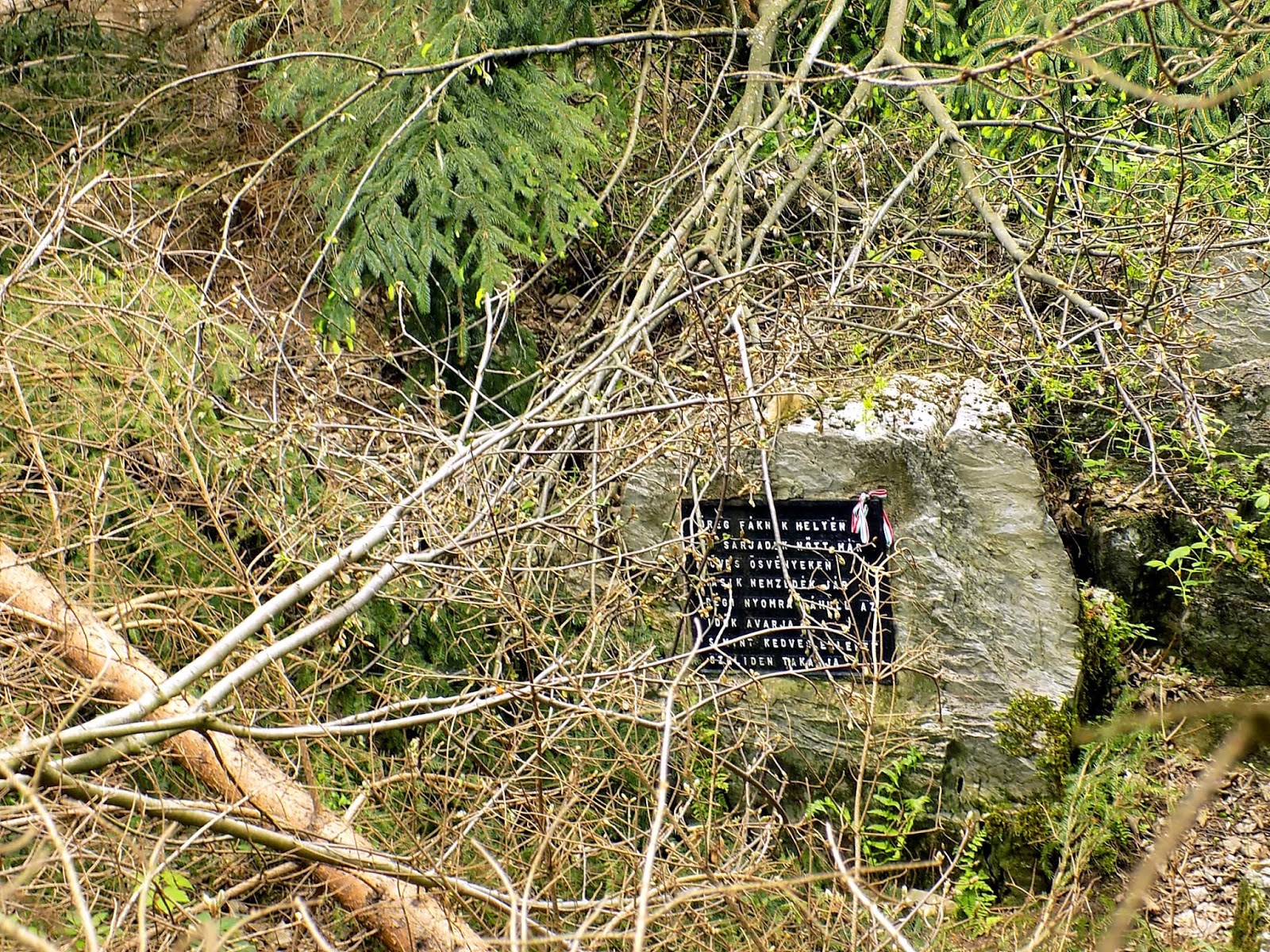 Némi keresgélés után találtuk meg a Kühne-emléktáblát az úttól kicsit távolabb, a pusztítás mélyén. A táblát Kühne Andor emlékére állították, aki a Magyar Turista Egyesület Borsodi Bükk Egyletének alapítója volt. A táblán fia, Kühne Pál verse olvasható.