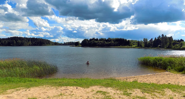 Tartu felé már jóval kevesebb volt az emelkedő. Mivel az idővel jól álltunk, megálltunk a Pangodi tónál. Óriási királyság volt! Ez egy elképesztően gyönyörű tó az út mellett, szabadstranddal. Eleinte viccnek gondoltam, amikor Bogi azt mondta, hogy ő bizony belemegy, de hamar meggyőztem magam, hogy jó lesz az nekem is. Végülis azért voltunk úton, hogy olyan dolgokat csináljunk, amiket a hétköznapokon nem szoktunk. 15 fokban bikinire vetkőzni és pancsolni, na azt nem szoktam. A víz jeges volt, de hamar megszoktam annyira, hogy ki se akartam menni.
