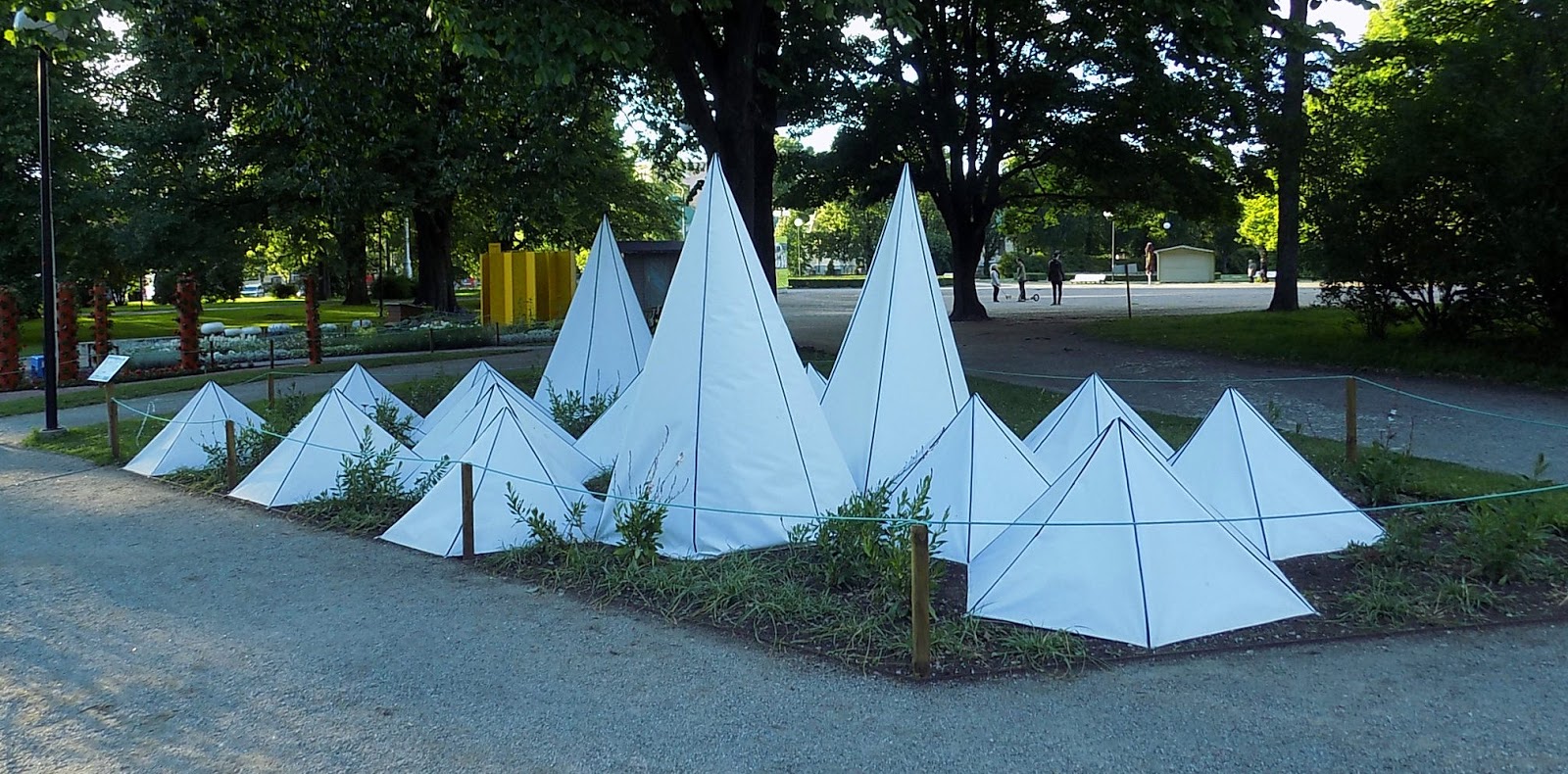 A magyarázat szerint Victor Vasarely munkássága adott ihletet a Főkert magyar dizájnerének. Háááát… lehet, hogy papíron még jól nézett ki, de alapból olyan művel pályázni, ami csak felülnézetből mutatja meg az értelmét és egyébként úgy néz ki, mint egy fesztivál sátortábora, háááát. Én ezt átgondoltam volna.