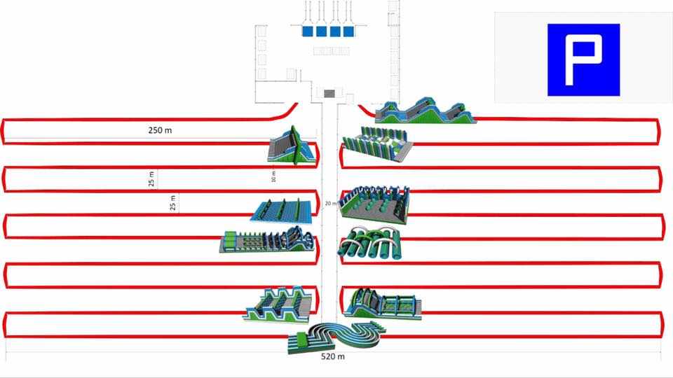 | A pálya. A jobb felső akadály volt a célnál, végül három részre szedték, és a legnagyobb csúzdán értünk be a célba. |