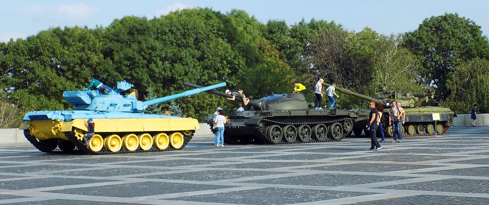 A szobor egy II. világháborús szabadtéri múzeum része, és természetesen itt is minden nagyon monumentális. A szobor előtti placcon tankok állnak, közülük az egyiket az ukrán zászló színeire festették át. Ez is a 2014-es forradalom idején történt, és óriási szimbolikus jelentőséggel bírt.