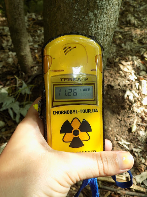Mértünk radioaktivitást a Vörös-erdő felé – ez a környék legsugárzóbb része. Nevét onnan kapta, hogy vörösesbarna színűvé váltak a fák az erőmű katasztrófája után. A szennyezett erdőt ledózerolták, de újra nőttek, és rettentően sugároznak. Nem érdemes sok időt a közelben tölteni.