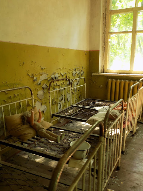 Az épületben járni megrázó, főleg amikor meglátja az ember a felragasztott óvodai jeleket. Itt is bejátszik a para faktor, műanyag babákat látsz mindenhol műanyag babákkal és nyitott könyveket. Azért ez az evakuálás nem úgy nézett ki, hogy azonnal csapot-papot otthagyott mindenki, szóval nekem itt is sántít, hogy minden egyes helyen, ahol könyvek maradtak, mindig nyitva vannak, hogy a kíváncsi turisták le tudják őket fotózni.