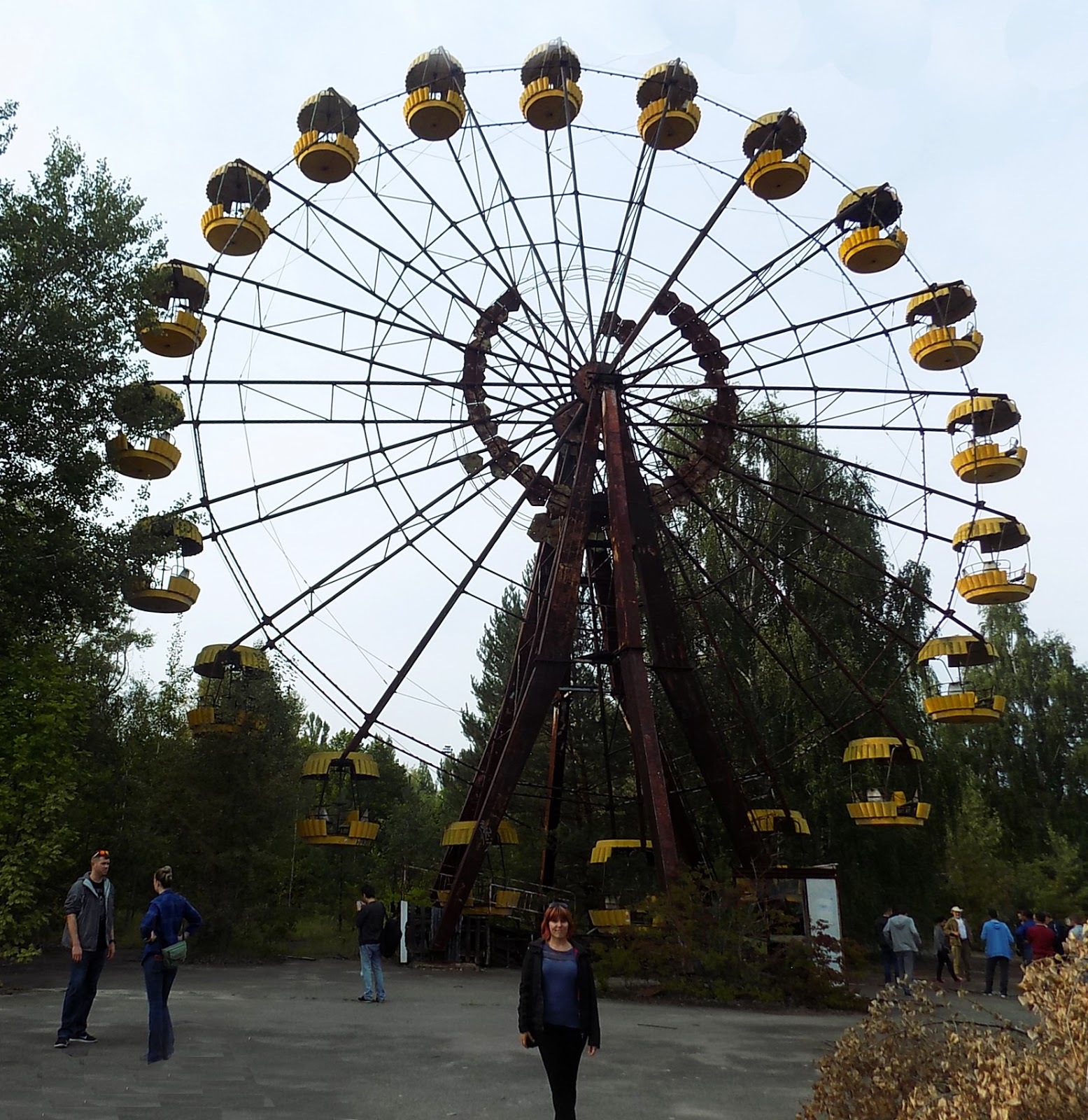 Mázlink volt, a találkozóhely Taras lakásától rövid sétányira volt, a Kijev-Paszazsirszkij vasútállomástól nem messze. Útravalónak a fornettistől (!) vettünk péksütit, majd megkerestük a buszt. Amiből volt három. Kicsit tanácstalanok voltunk, de hamar szóba elegyedtünk az egyik guide-dal, és megtudtuk, hogy a nagybusz és az egyik kicsi az angol nyelvű túrára jelentkezőké, a maradék kicsi pedig az orosz nyelvűeké. Invitált minket a kisbuszhoz, de a nagy busz szimpatikusabbnak tűnt. Jól választottunk, a guide-unk, Helen, a legszenvedélyesebb túravezető, akivel valaha találkoztam. Értem ezt úgy, hogy egyszerűen érezni lehetett végig, hogy számára ez a téma nagyon fontos, küldetésének érzi az informálást és a résztvevők előítéleteinek lebontását. Nagyon sokat beszélt arról, mennyire túlhype-olt a médiában a sugárzás erősségének szintje a zónában. Valóban előszeretettel emlegetik a leghalálosabb helyek egyikeként Csernobil környékét, ami igaz is volt 30 éve. De azóta eltelt 30 év.