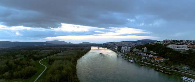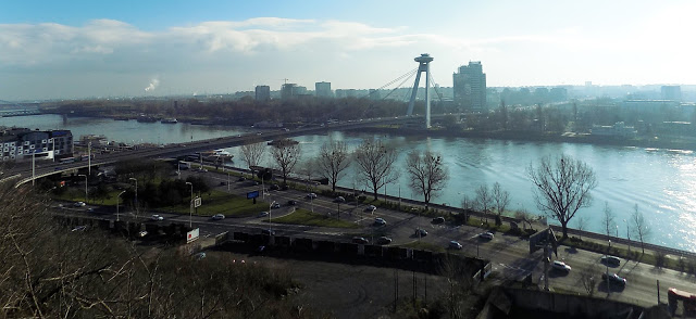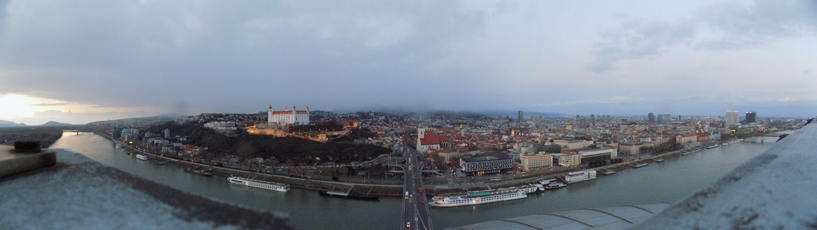 A Duna túlpartja tobzódik a panelrengetegben, gyárkémények ontják a füstöt, csak a távolban lomhán pörgő szélkerekek adtak egy kis megnyugvást. A másik irányba nézve a városból is főként a modern irodaépületek magasodtak ki. Nem éppen szívmelengető látvány.