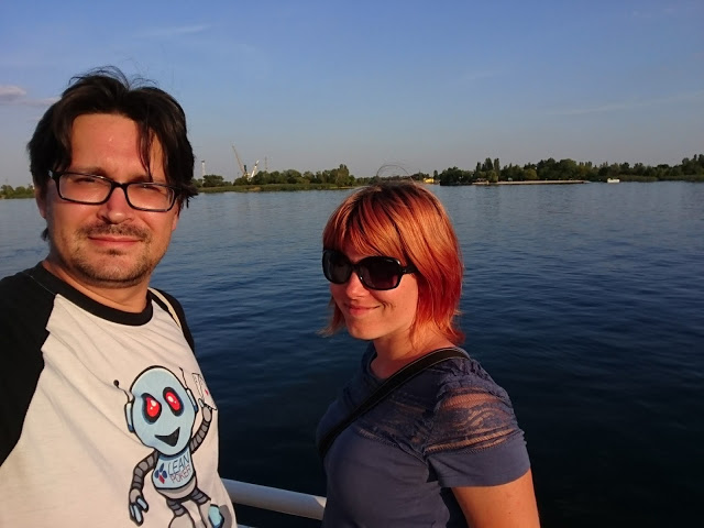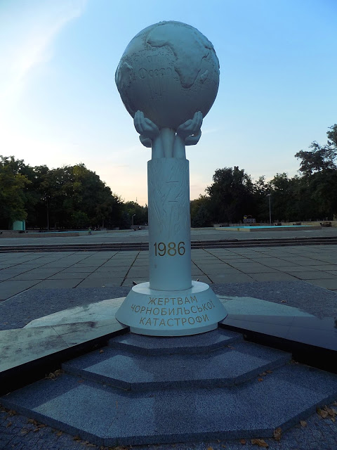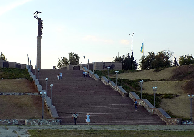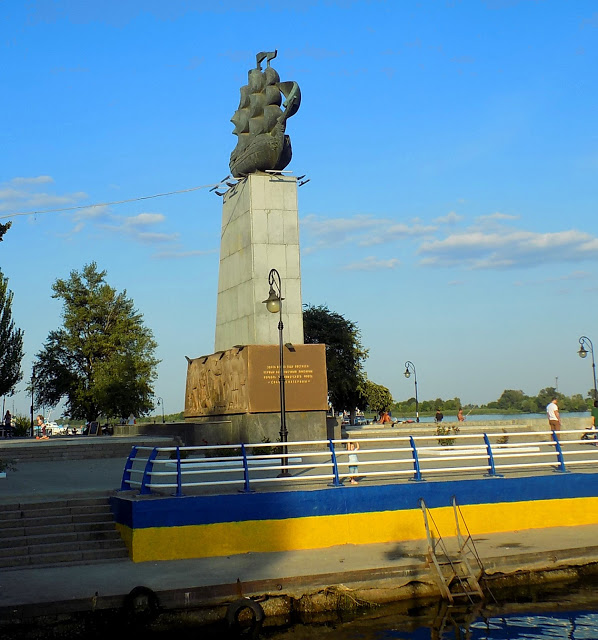 Innentől nem volt más dolgunk, csak a városban mászkálni. A sétálóutcán leültünk egy szimpatikus helyre, ahol megebédeltünk, és a pincér srác olyan meggyőző volt, hogy két sört is megittunk. Ebéd után lesétáltunk a Dnyeper partjára. Egy hajókikötőbe értünk, ahol a az első hajósok emlékére állított szobra található. Nem sokat időztünk itt, nem volt sok látnivaló, átsétáltunk inkább a Slavy parkba.