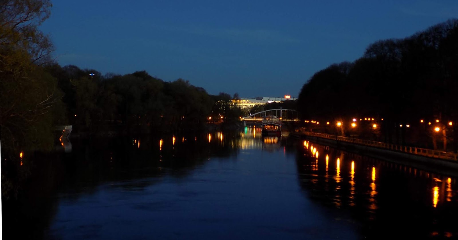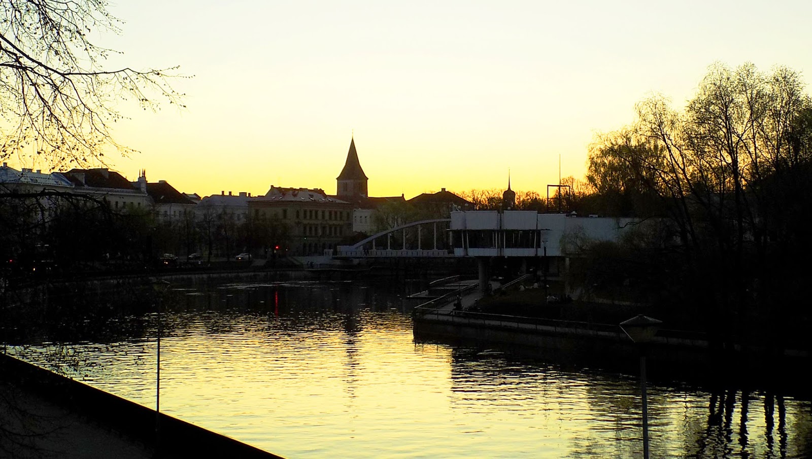 A folyópart mindkét oldalán gyalogsétány fekszik, és több helyen pad helyett hintába vághatja magát az ember. A fűben fiatalok üldögéltek, a sétányon futók tartották meg az esti edzést, a távolban pedig a színváltós híd pompázott változatos színekben.