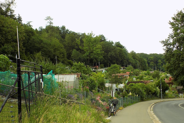 Odébb a Familiengärten virágoskertjei mellett haladtam el. Egészen hihetetlen, az egész domboldal tele van kis házikókkal és virággal. Ahogy az egyesület honlapján olvasom, vannak területi viták, el is kellett dózerolni kerteket 2006-ban, és épp a kertek elé épül egy bazinagy épület az út túloldalára, teljesen kitakarva a kilátást.
