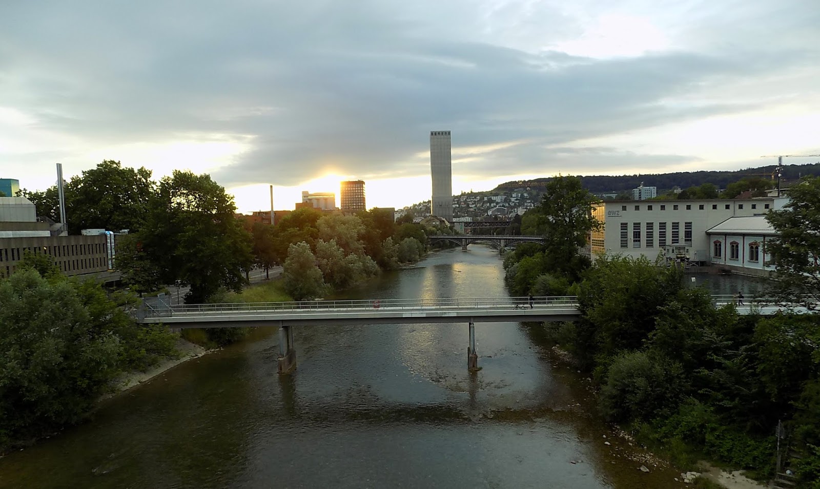 A híd másik oldalán épp eltűnt a nap a toronyépület mögött.