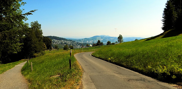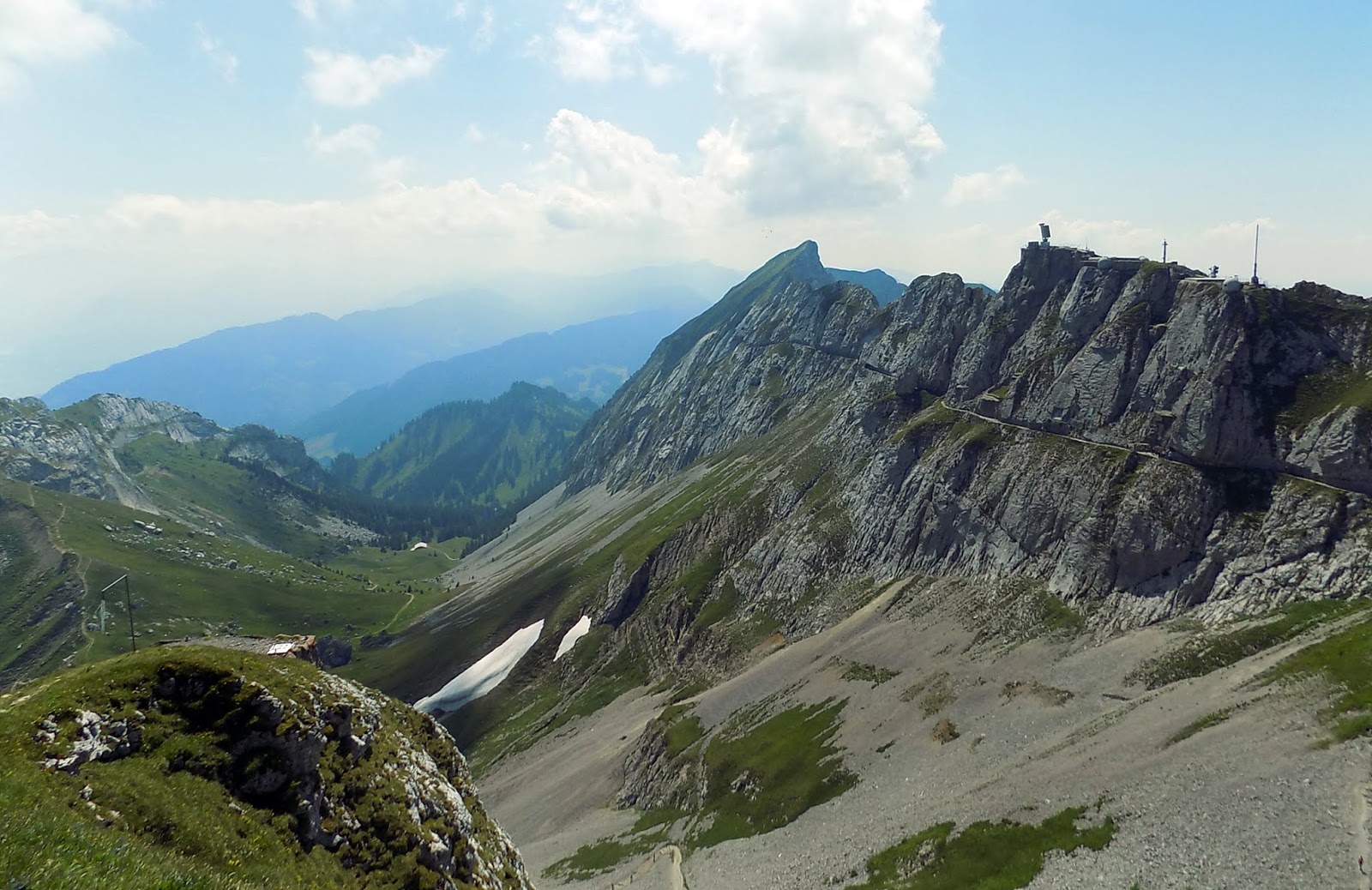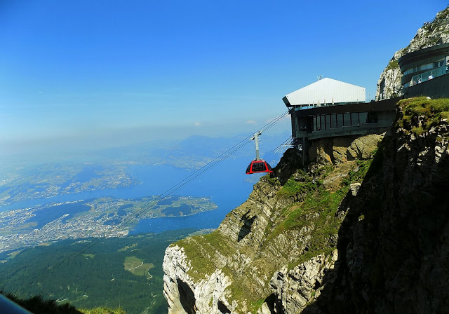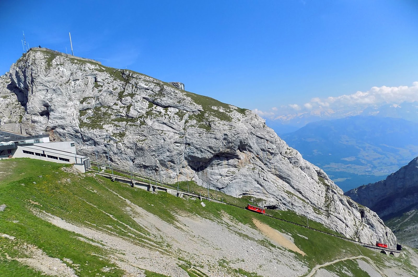 A hegy másik oldaláról érkezdik a világ legmeredekebben járó fogaskerekű kisvasútja. A kisvonat 1889 óta jár ezen a vonalon. Van szakasza, ahol 48%-os emelkedőn küzdi fel magát. Nekünk ez az út most kimaradt, nem terveztünk vele, és már a hegynél voltunk, amikor rájöttünk, hogy jaaa, hogy ez az a fogaskerekű! Míg elkortyoltunk egy sört és bámultuk a tájat, azt figyeltük, hogyan érkeznek a kisvasutak fel a hegyre.