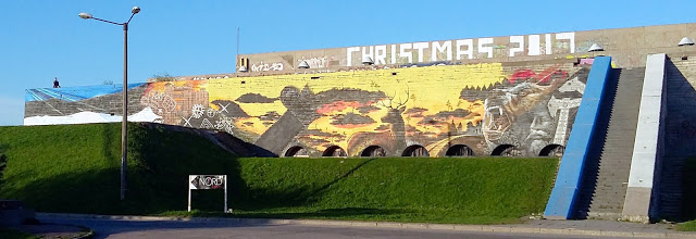 A Linnahall oldalában egy meglepően szép graffitit vettünk észre. Felhívnám a figyelmet a lépcsőre, ami az észt zászlót akarja imitálni a kék és fehér festéssel, a lépcső szürkéje lenne a fekete. Szerintem zseniális. A rajzon az élesfogú medvére lehet egy tippje mindenkinek, mit akar jelképezni.