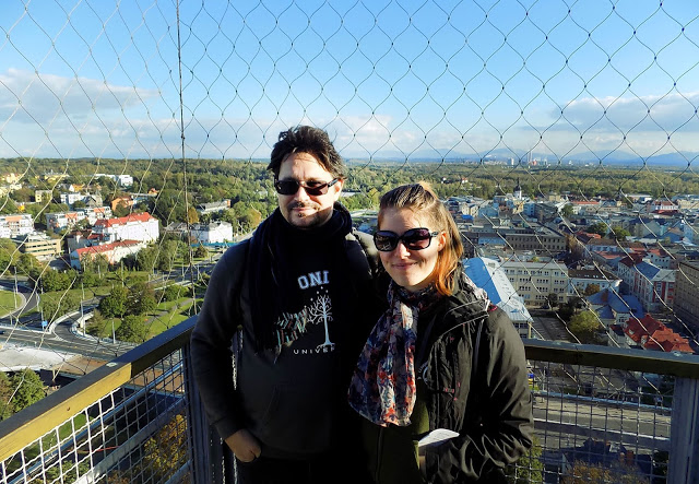 Odaérve láttuk, hogy a toronyban emberek vannak – innentől nem volt kérdés, hogy mi is fel akarunk menni. Fellifteztünk a 6. emeletre a tourinform irodába, ahol fejenként 60 koronát fizettünk a toronylátogatásért. Innen újabb lift vitt fel a kilátóba, ami zsúfolásig tele volt. Nem gondoltam, hogy Ostravában ennyi turistával fogunk találkozni.