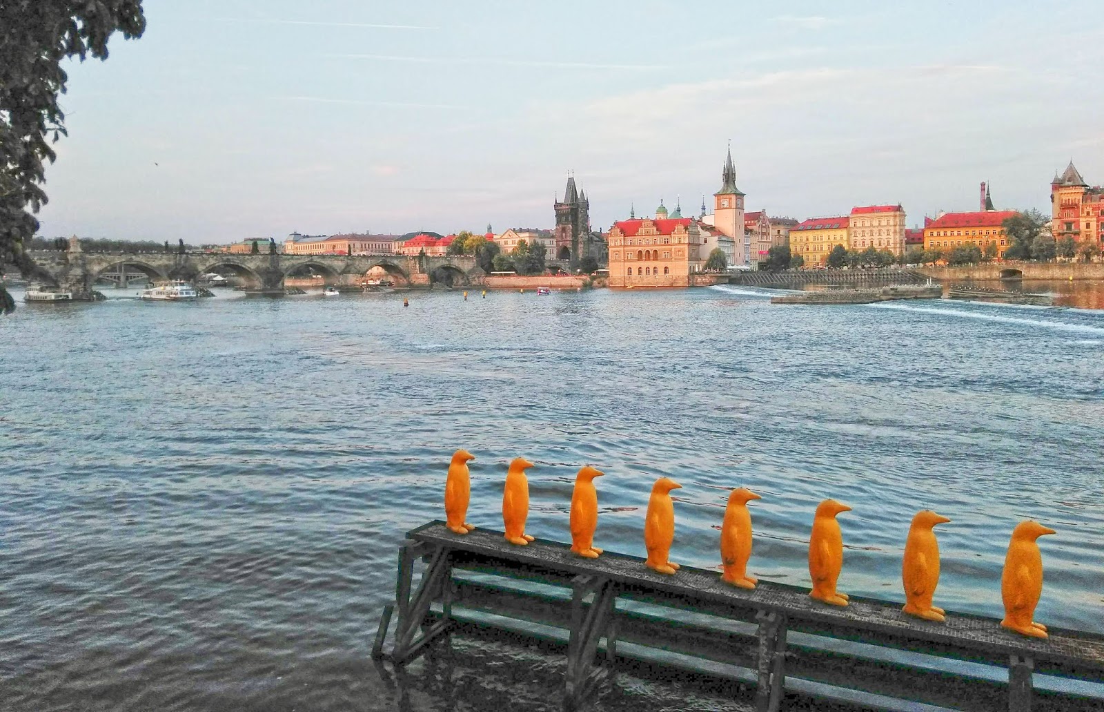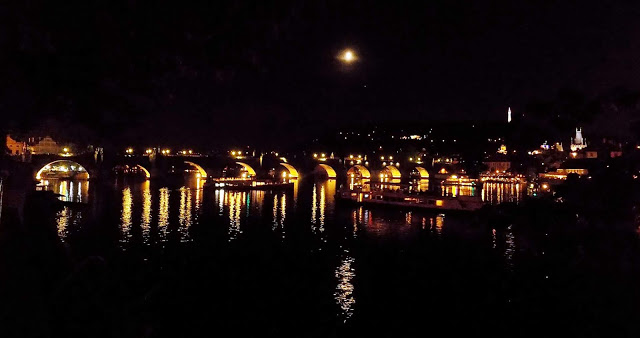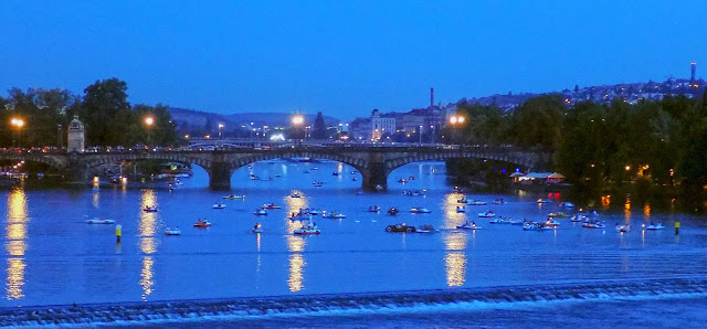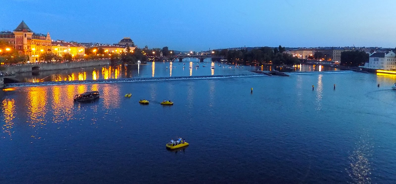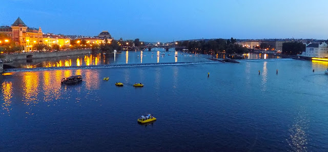 A Károly hídról láttuk, ahogy egy érdekes jelenet játszódik a vízen: néhány vízibicikli a tiltás ellenére túlment a bólyákon, és lecsorgott a kis vízesésen, majd próbáltak visszaevickélni. Nem tudom, hogy végül hogyan jutottak vissza, de gyanús, hogy nem úszták meg büntetés nélkül.