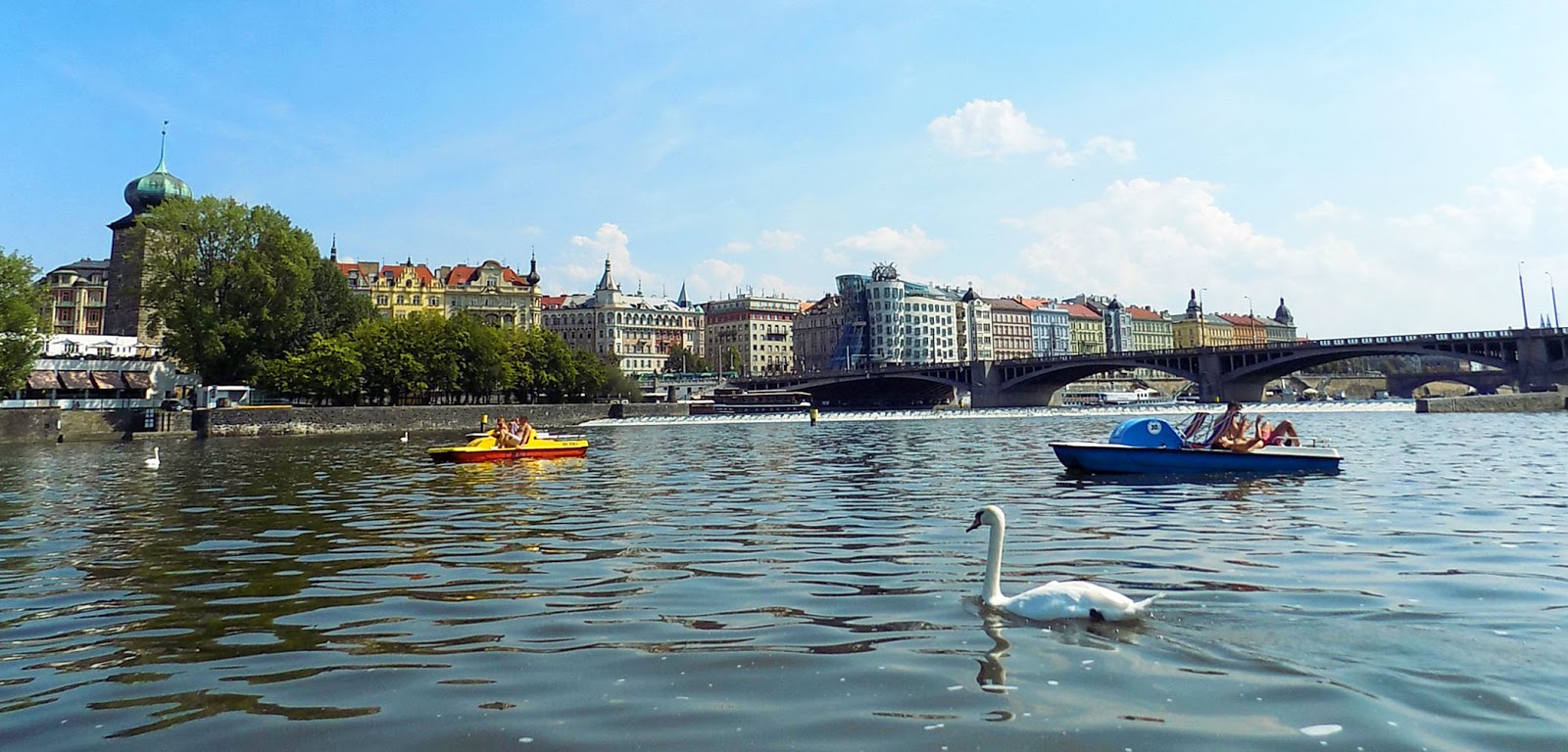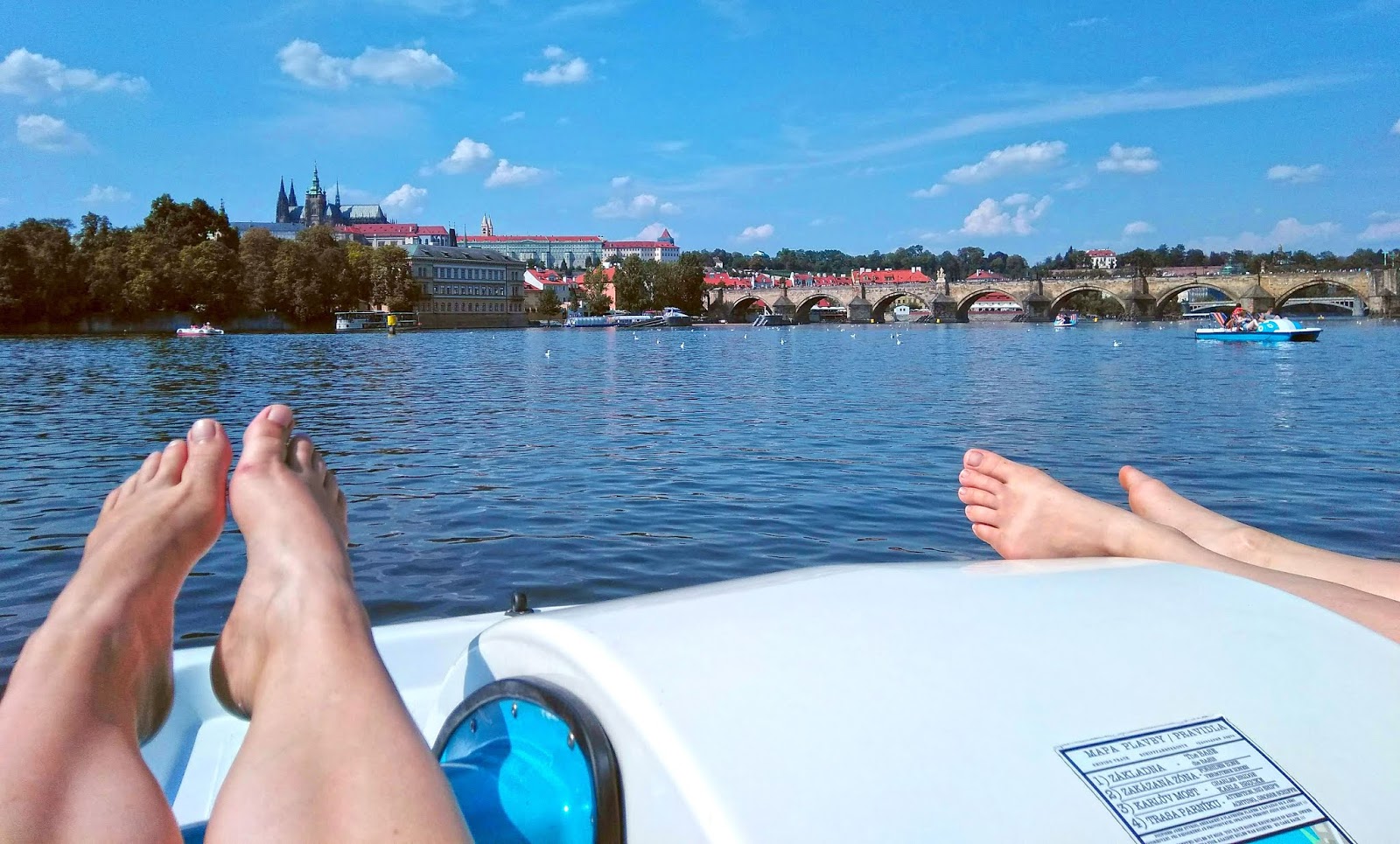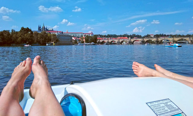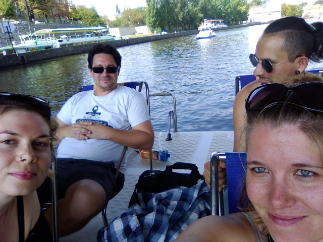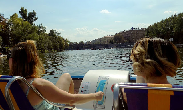 A harmadik napot teljes egészében vízközelben töltöttük. Vízibiciklizéssel kezdtünk a Vltaván. Ezúttal a másik vízibiciklist próbáltuk ki a Slovanský szigeten. Sokat nem szaroztak, fizettünk, megmutatták a térképen, merre ne menjünk, aztán már vittek is a kis hajódhoz, tekerjél, öcsém. Húggal felváltva kormányoztunk, én kifejezetten szeretek “vezetni”.