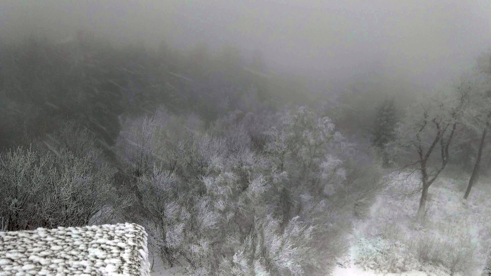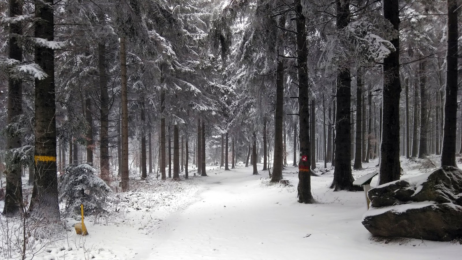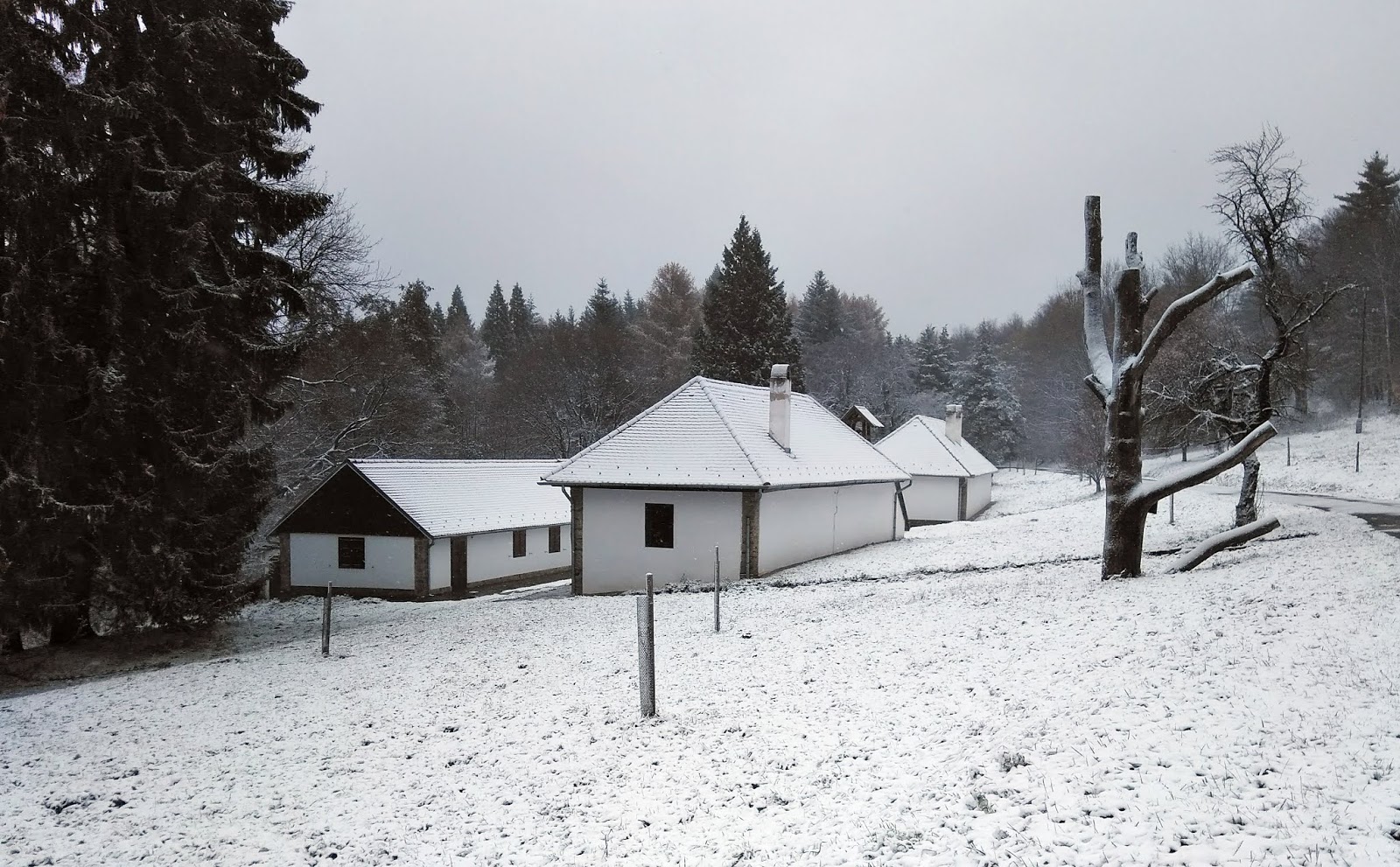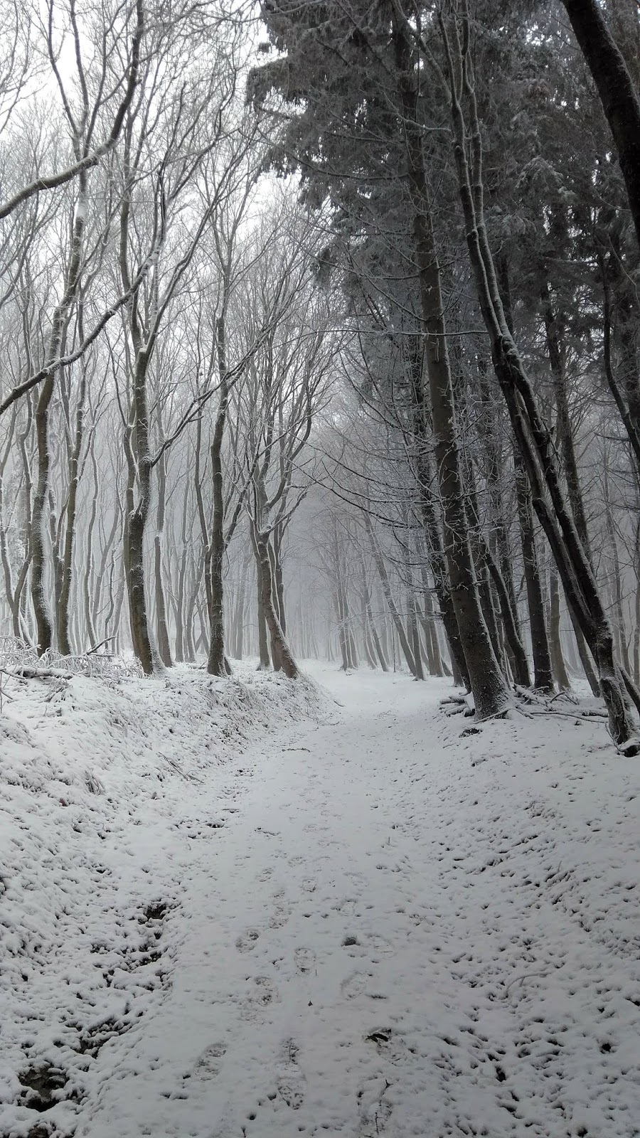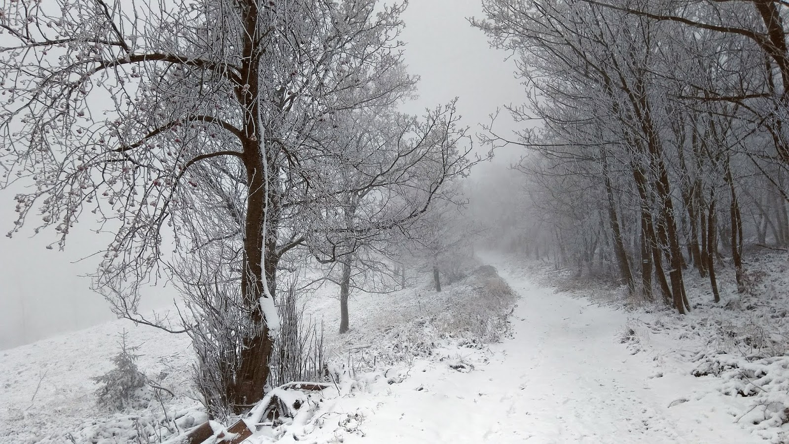 Elindultunk, és egy téli csodavilágba csöppentünk: körülöttünk havas fenyőfák, szűzhó a lábunk alatt, és a hó ha nem is nagy pelyhekben, de sűrűn hullott. Szélcsendről csak álmodhattunk: erős, hideg szél fújt, az aprószemű havat oldalirányból is bele tudta fújni a szemünkbe. Hamarosan láttuk, hogy itt bizony hófúvás van, és a hegyekbe bizony már megérkezett a tél.