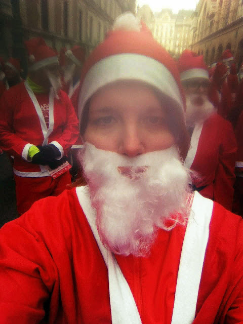 Igazából minden a szokásos menetrend szerint történt: közös bemelegítés, sok Mikulásruhás futó, családok, gyerekek, aztán rajt, tötymörgés, beduguló utcák, sétáló “futók”, előzési lehetőség a szűk utcákban alig, fáradó gyerekeket vonszoló szülők. Most még integető, lelkes szurkolók, meglepett, de vidám turisták se voltak. A szokásosnál is jobban idegesített, hogy nem lehetett haladni, siettem volna vissza befejezni a koszorúmat és a lányokkal lógni. Próbáltam előzgetni, de így is 16 perc telt el, mire beértem a célba. A befutócsomag bőséges volt: többféle csoki, üdítők, zsebkendő, két bevásárlótáska.