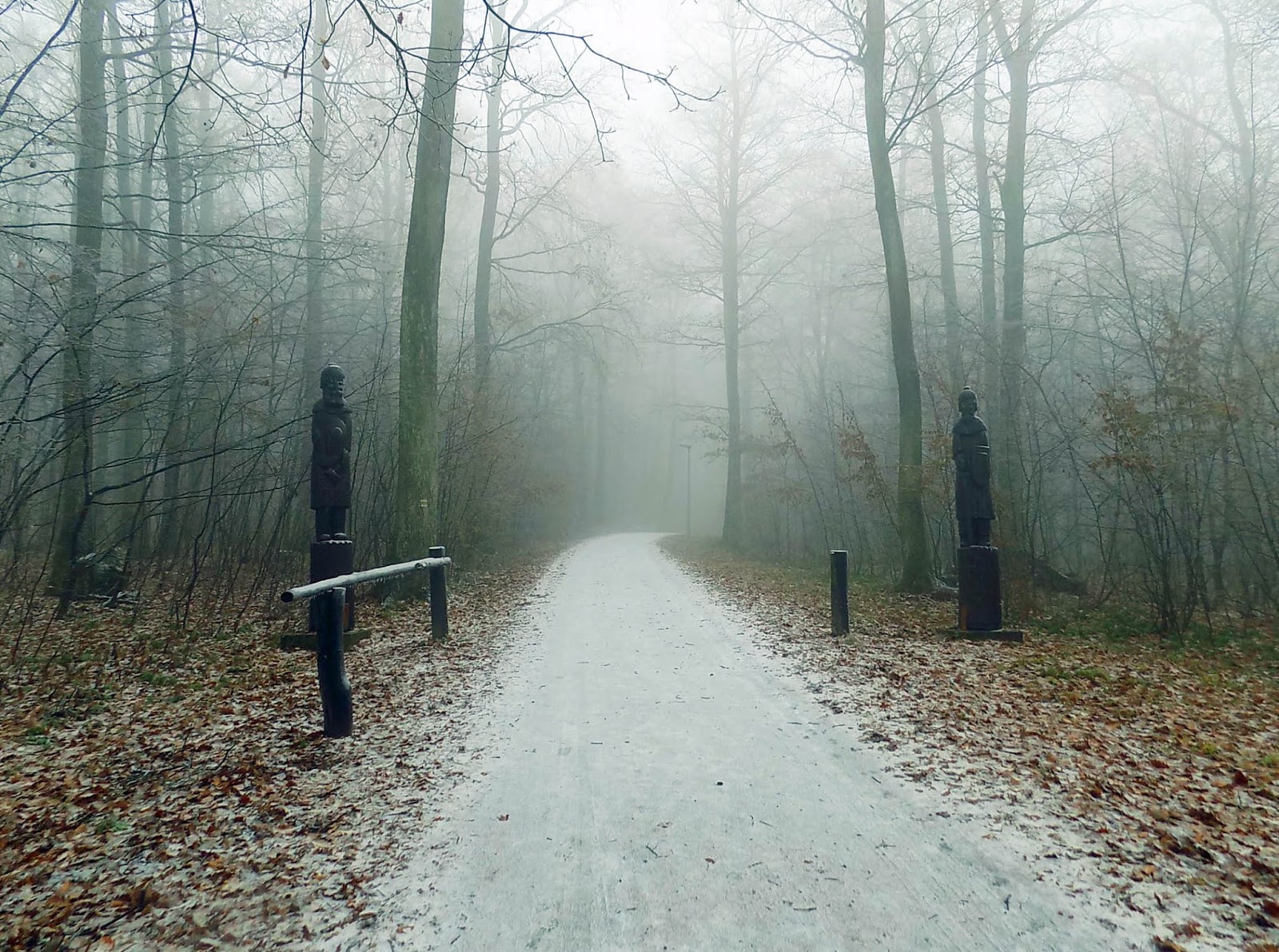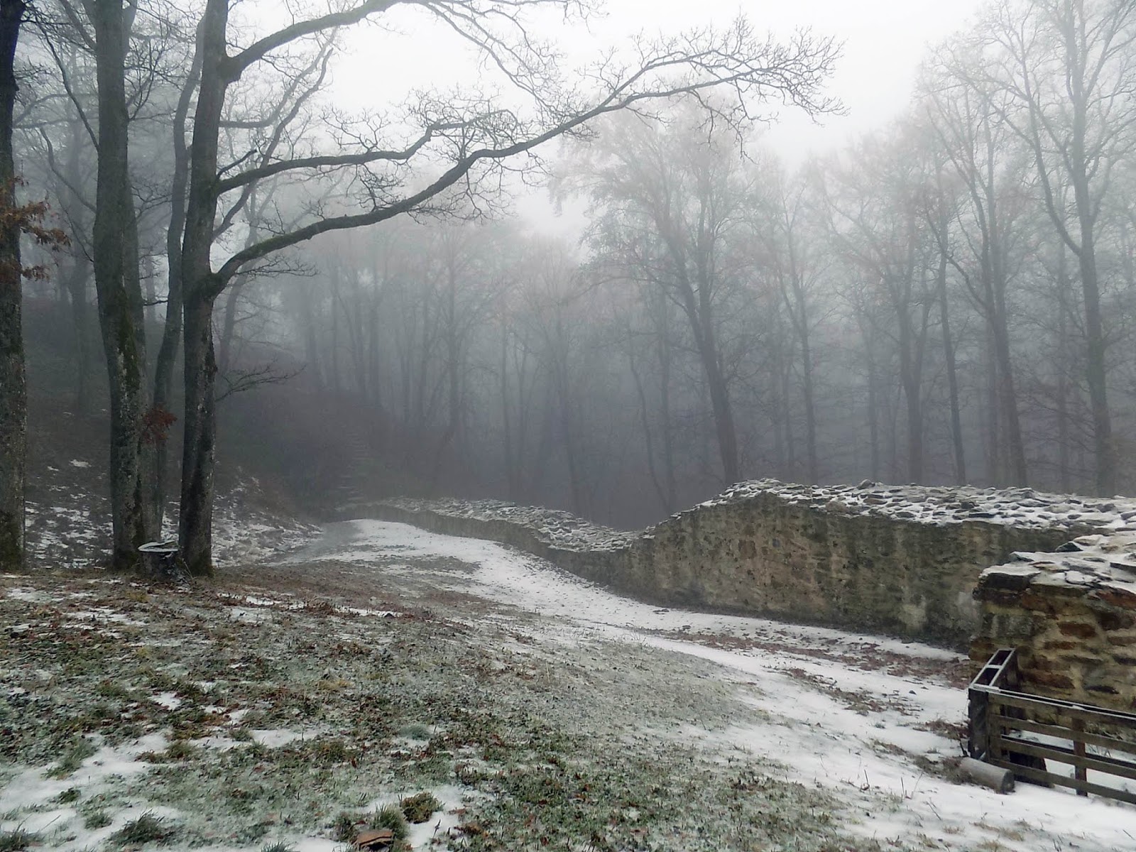 A parkolóig vitt taxisunk, onnan negyed órát sétáltunk ködben a csúszós erdei úton.