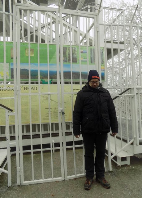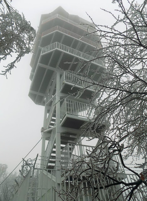 Lépcsőn másztunk fel a kilátóhoz, természetesen zárva volt az is. Nem csodáltam egy pillanatig se: odafent erős szél fújt, havazott, és jeges volt minden, már a lépcső és a korlát is nagyon csúszott, a kilátóba kínszenvedés lett volna feljutni.