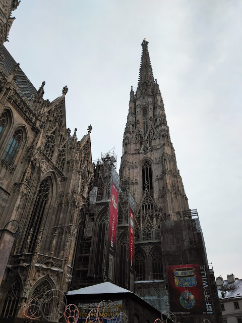 A Stephansdomnak van egyébként szép magyar neve is, Szent István-székesegyház, de nem nagyon hallottam még így emlegetni. Már a 12. században templom állt a helyén, ezt építették át több alkalommal, míg a mai gótikus formáját el nem nyerte. Nevét az első keresztény vértanúról, Istvánról kapta. 1945-ben a háborúban kigyulladt és részben leomlott, de szinte azonnal elkezdték az újjáépítését – a mai napig restaurálják, ezért is van szinte mindig felállványozva.