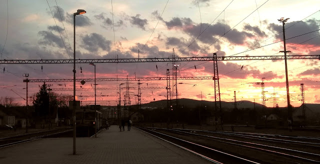 | A végére egy kép másnap estéről: naplemente a veszprémi vasútállomáson |