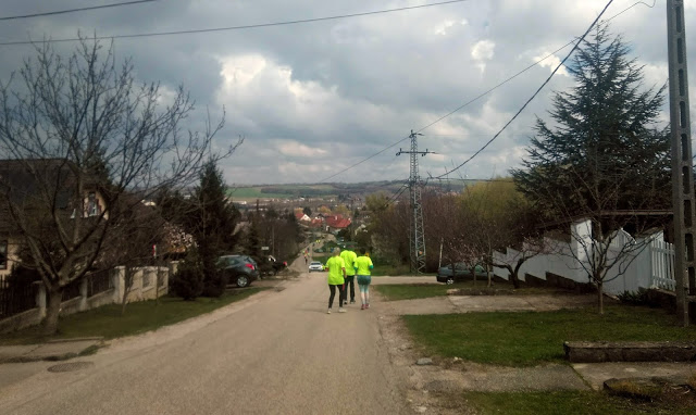 Délután 1-kor rajtoltunk. Nem voltunk sokan, 2-300an maximum, de legalább családias volt a hangulat, nem volt tömegrendezvény fíling. Átfutottunk a 82-esen, majd fel a Bakonybéli úton, ki egészen a város határáig. Jó volt, hogy az emelkedőt letudtuk a legelején. Direkt nem futottam el az első szakaszt, felkocogtam a “hegyre”, kerülgetve a gyors rajt után sétára váltó futókat. Az emelkedő után felváltva futottunk szintben és lefelé. Odafentről szép volt a táj is, és jólesett a laza terep.