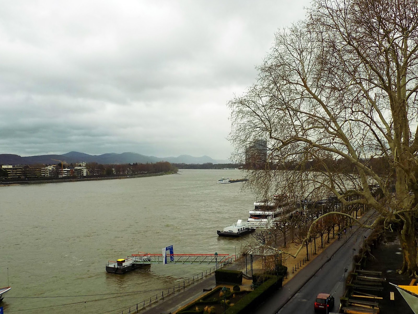 Újra csöpögött az eső, amikor a Rajna partjára értünk. A folyómenti sétányon tettünk egy kis sétát.