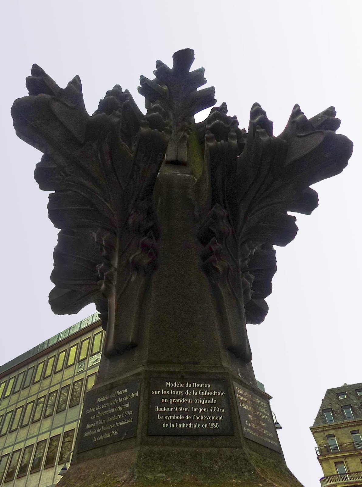 Minc a bejáratnál várt, mire leértem. A dóm előtti téren meglepve vettünk észre egy szobrot, ami valójában a dóm tornyain látható keresztvirág életnagyságban, és erre a sok tábla között egy magyar nyelvű is felhívja a figyelmet.