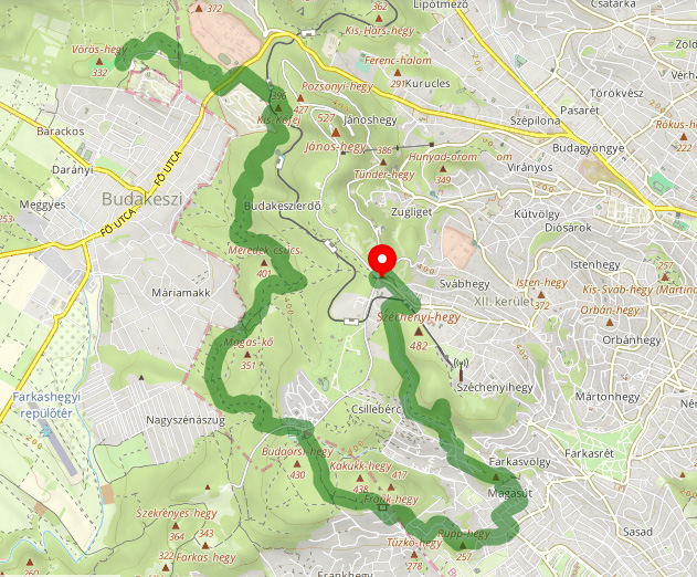 Útvonal: Normafa – Úti Madonna – Ördög-szószék – Frank-hegy – Végvári-szikla – Makkosmária – Csacsi-rét – Vadaspark vasúti megálló – Budakeszi Vadaspark