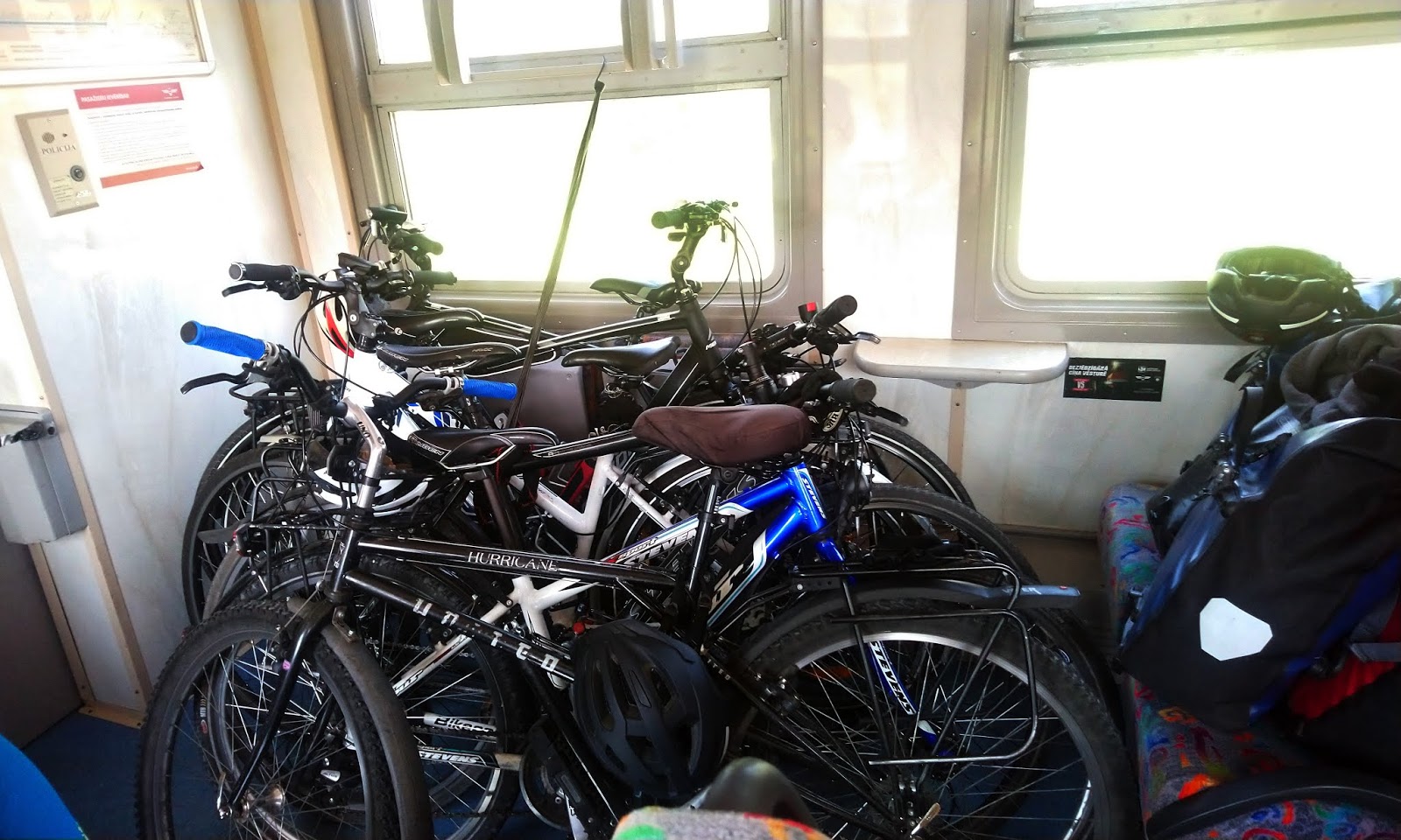Megkaptuk a bringákat, elintéztük az anyagiakat, majd a frissen szerzett járgányokon elgurultunk a vasútállomásra. A vonatunk már bent állt. Hivatalosan két bringás hely volt a kocsiban, de rajtunk kívül is még rengetegen jöttek biciklivel, úgyhogy megpakoltuk a tárolót alternatív módszerrel elhelyezett cangákkal rendesen. A kalauz néni nem szólt érte, ezek szerint nem veszik ezt annyira komolyan, mint hittük. (A hivatalos tájékoztató szerint, ha nem férne fel a bicikli, akkor nem lehet felvinni – ezért is siettünk, hogy hamar ott legyünk a vonatnál.)