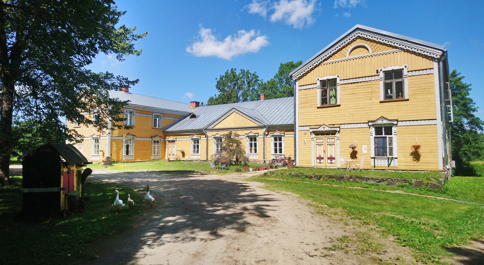 A tavaly már meglátogatott Sänna udvarházban tartottunk egy pihenőt. Két nap múlva kezdődött a 6. Finnugor Filmfesztivál, a FUFF. Még senki nem volt a helyszínen a szervezők közül, de megengedték, hogy körülnézzünk. Bogival mi már ismerősök voltunk itt tavalyról. Hintáztunk, körbejártunk a házban, én vettem gyertyát nagyanyámnak, és túléltük a házőrző ludak támadását is.