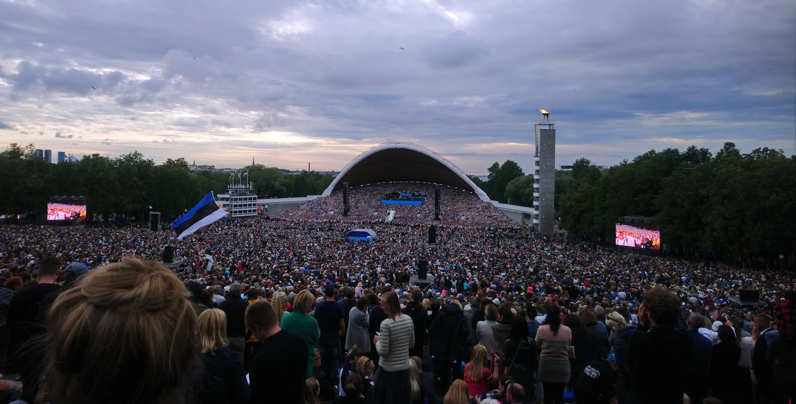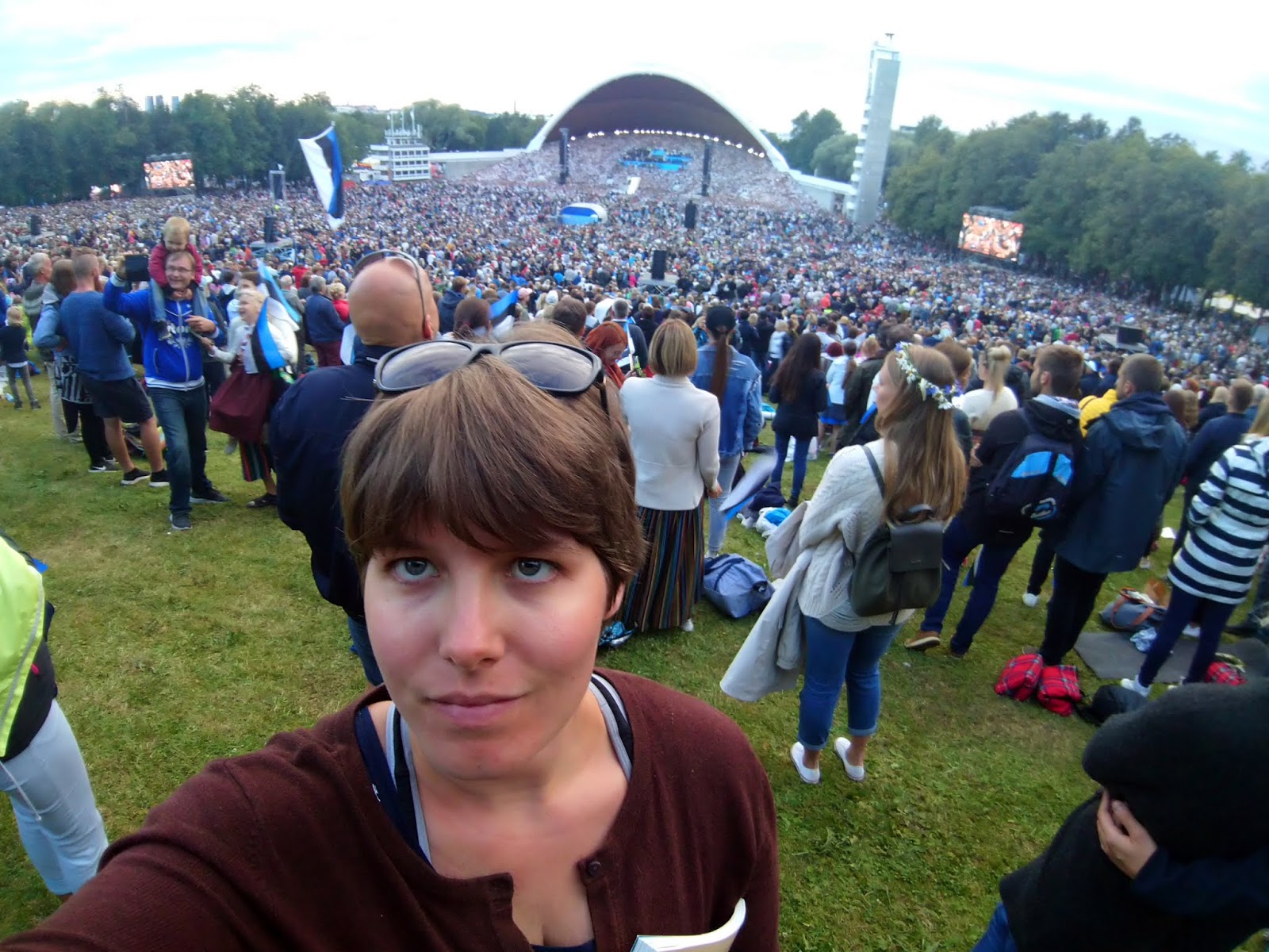 A második napot én kevésbé élveztem, mint az elsőt. Az első nap nyilván rövidségéből fakadóan összeszedettebb volt, pörgősebb, bensőségesebb, engem sokkal jobban megérintett. A második nap inkább piknikjellegű volt, a zene sokszor csak háttérzajként ment. Este 8 körül már mi is közelebb mentünk, néztük a kivetítőt, próbáltunk énekelni, de kényelmetlen volt a tömegben egymáshoz nyomódva álldogálni, és az emberek alig énekeltek, ami tök bénaság. Azért mentem, hogy az észtekkel énekeljek, erre nem énekeltek. A kulturális miniszter is megszakította egyszer a műsort egy beszéddel, amiből nem sokat értettem, de azt érzékeltem, hogy sokan morogtak a beszéd alatt, és később a hírekben is azt olvastam, hogy nagyon nem odaillő dolgokat mondott, és próbált politikát csinálni az egész dalosünnepből.