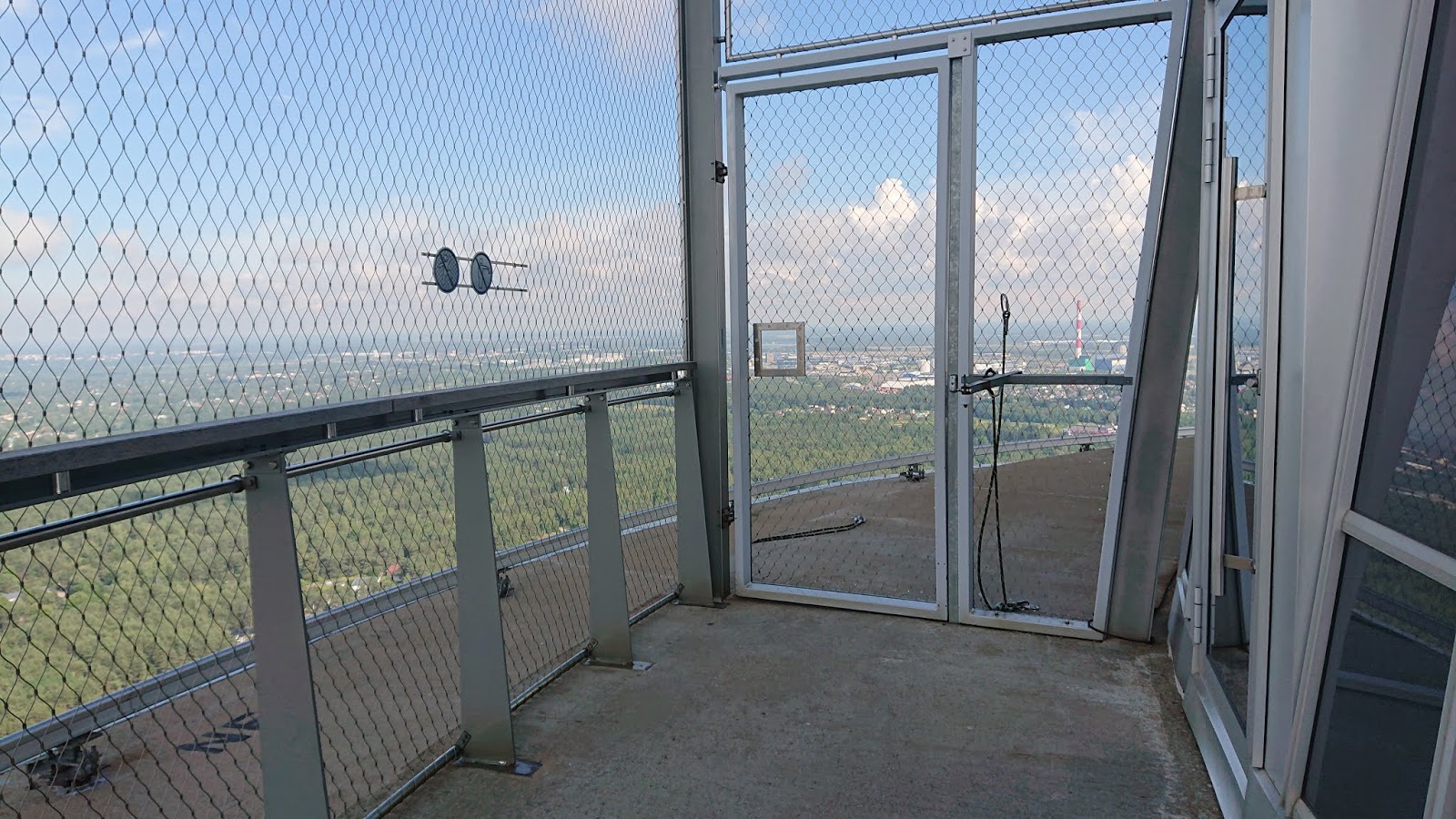 Besétáltunk a recepcióra, és mondtuk, mi járatban vagyunk. Kifizettük a belépőt, fellifteztünk és 21. emeletre, ahol körbe lehet sétálni és bentről csodálni a kilátást. Nem csak kilátás, hanem kiállítás is van odabent, genetikáról és az emberről, ami érdekes, csak nem teljesen tiszta, miért pont ott látható. Körbenéztünk, aztán az infópultnál szóltunk, hogy mi bizony kimennénk a torony szélére. Aláírtunk egy nyilatkozatot, hogy saját felelősségre megyünk ki, beöltöztünk, és a vezetőnkkel felsétáltunk a 22. szintre, ahol egy étterem, a ráccsal zárt kilátó, és a perem található.