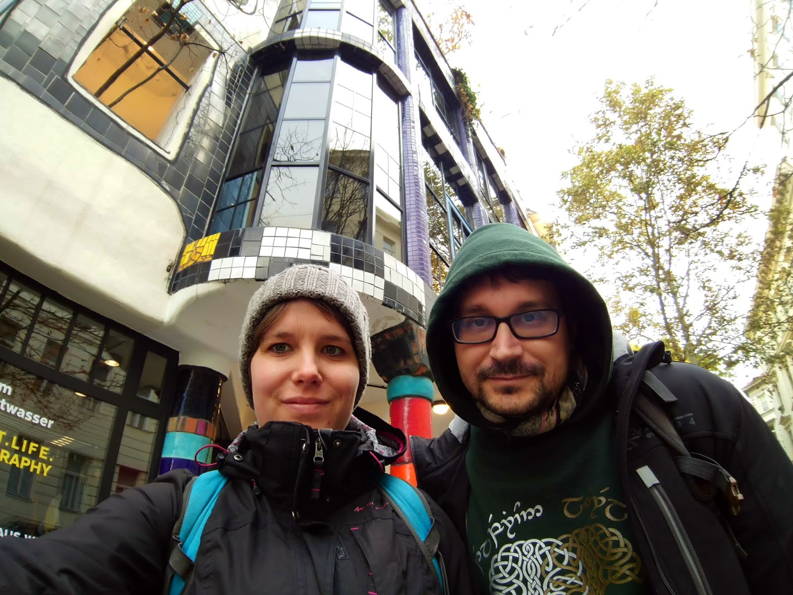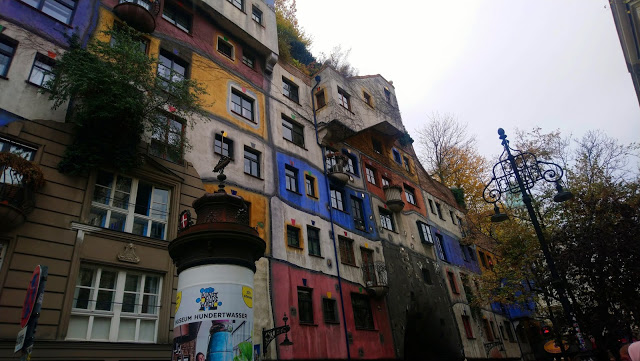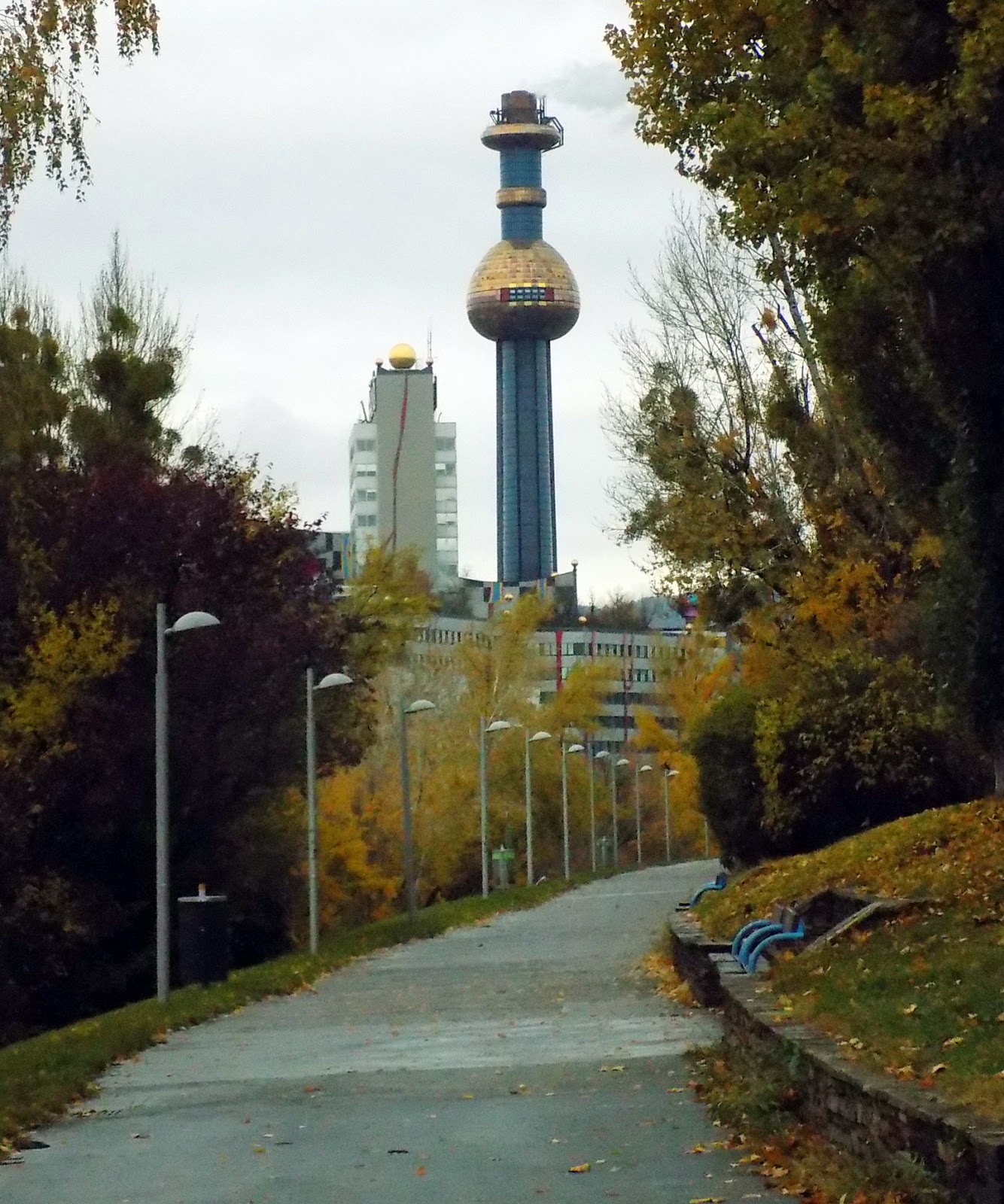 A folyóparton egy kellemes sétányon baktattunk Spittelauhoz. Szemerkélt az eső, de a sárga falevelek és a színes Hundertwasser-épület látványa bőven kárpótolt.