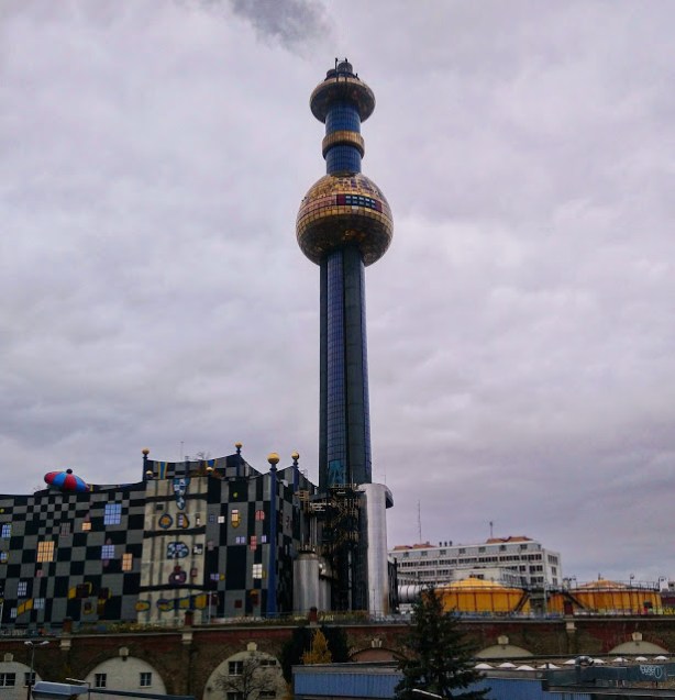 Szombaton 10-ig kellett kicsekkolni, ami nem is baj, legalább időben elindultunk a városba. Nem volt sok időnk, délután 3-kor indult a busz Budapestre. A Hundertwasserhaushoz terveztünk először elmenni apfelstrudelt enni (az ottani kávézóban adják a világ legjobb apfelstrudelét), de ahogy sétáltunk a Friedensbrücke metrómegálló felé, észrevettem, hogy egy másik Hundertwasser által tervezett (valójában átalakított) épület van a közvetlen közelünkben: a spittelau-i szemétégető és távhőszolgáltató épülete. Hundertwasser eleinte vonakodott attól, hogy egy szemétégető épületét tervezze meg saját stílusában, lévén nagy környezetvédő, de megígérték neki, hogy a legmodernebb berendezéseket fogják az égetőben használni. 1992-ben készület el a színes külső, szerintem a világon nincs még egy ennyire vidám és egyedi szemétégető.