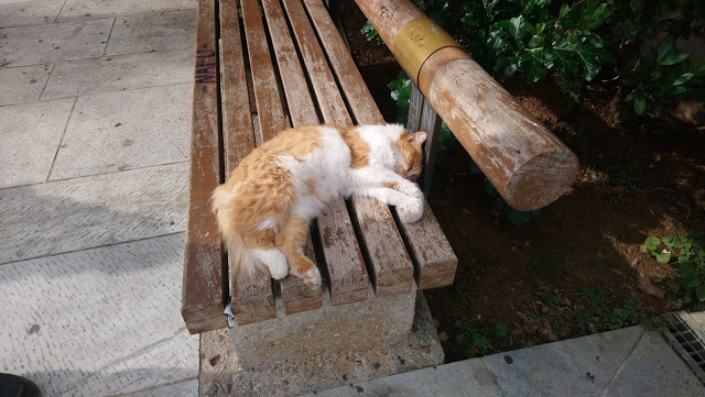 | Ez a macska órákig szunyókált a padon, bárki megsimogathatta, aki akarta |