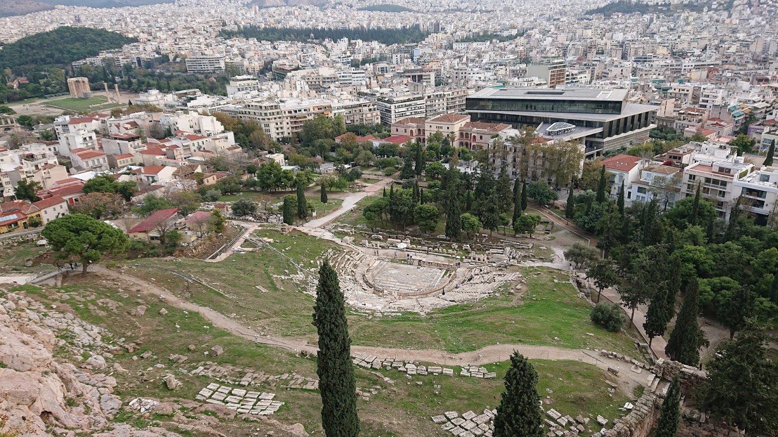 | Dionüszosz színház a magasból, vele szemben az Akropolisz Múzeum az elforgatott felső szinttel (fox fotója) |